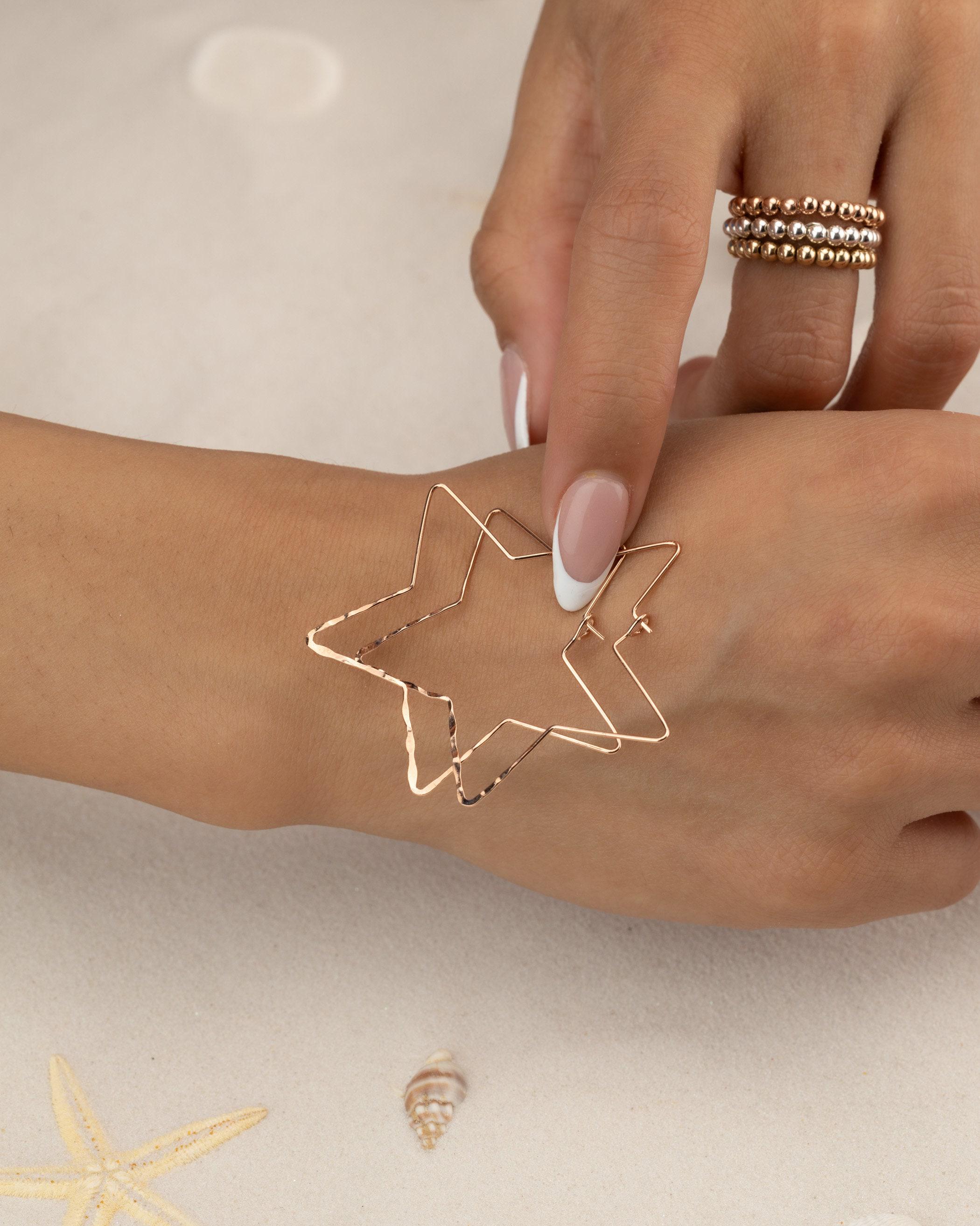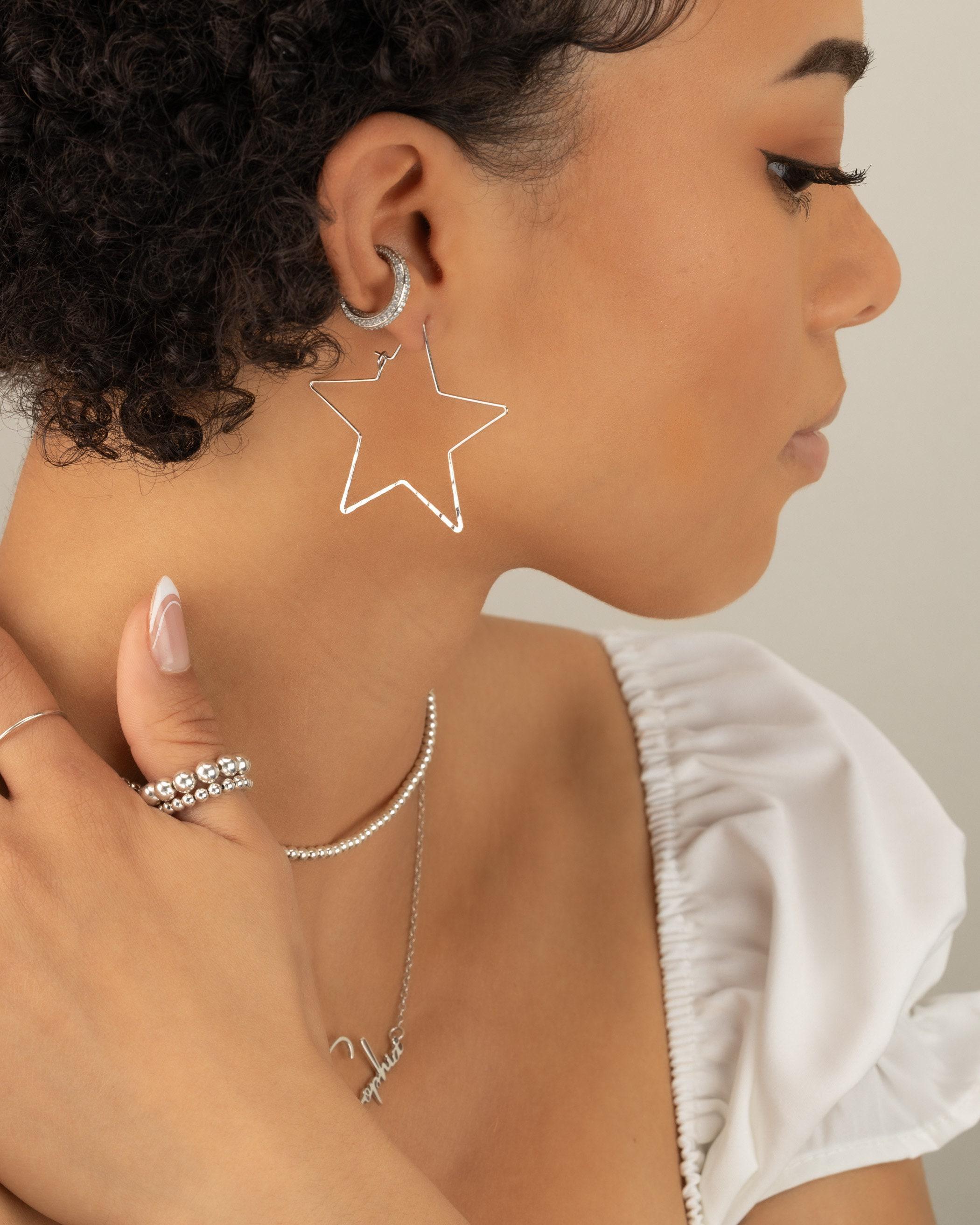 Discover the perfect blend of elegance and everyday wearability with these delicate star hoops. Designed as lightweight, large earrings, they add a subtle yet striking statement to any look, whether you're embracing a celebration or elevating your minimalist jewelry collection. Crafted with a pretty hammered finish that catches the light as you move. These lightweight hoop earrings capture the essence of celestial bohemian or coastal cowgirl while being gentle on sensitive skin.