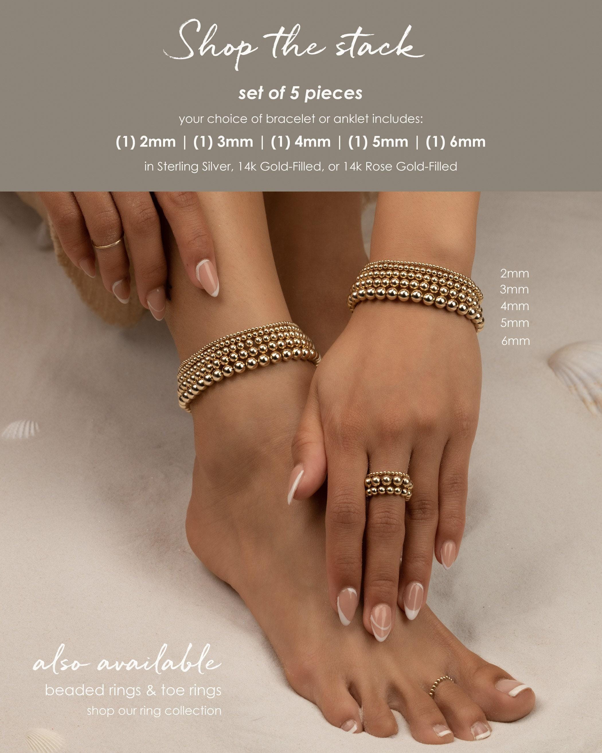 Our precious metal beaded bracelets and anklets are hand-strung on high-quality stretch cord. Mix and match bead sizes & colors for your own unique bracelet or anklet stack, or select our 'SHOP THE STACK'.