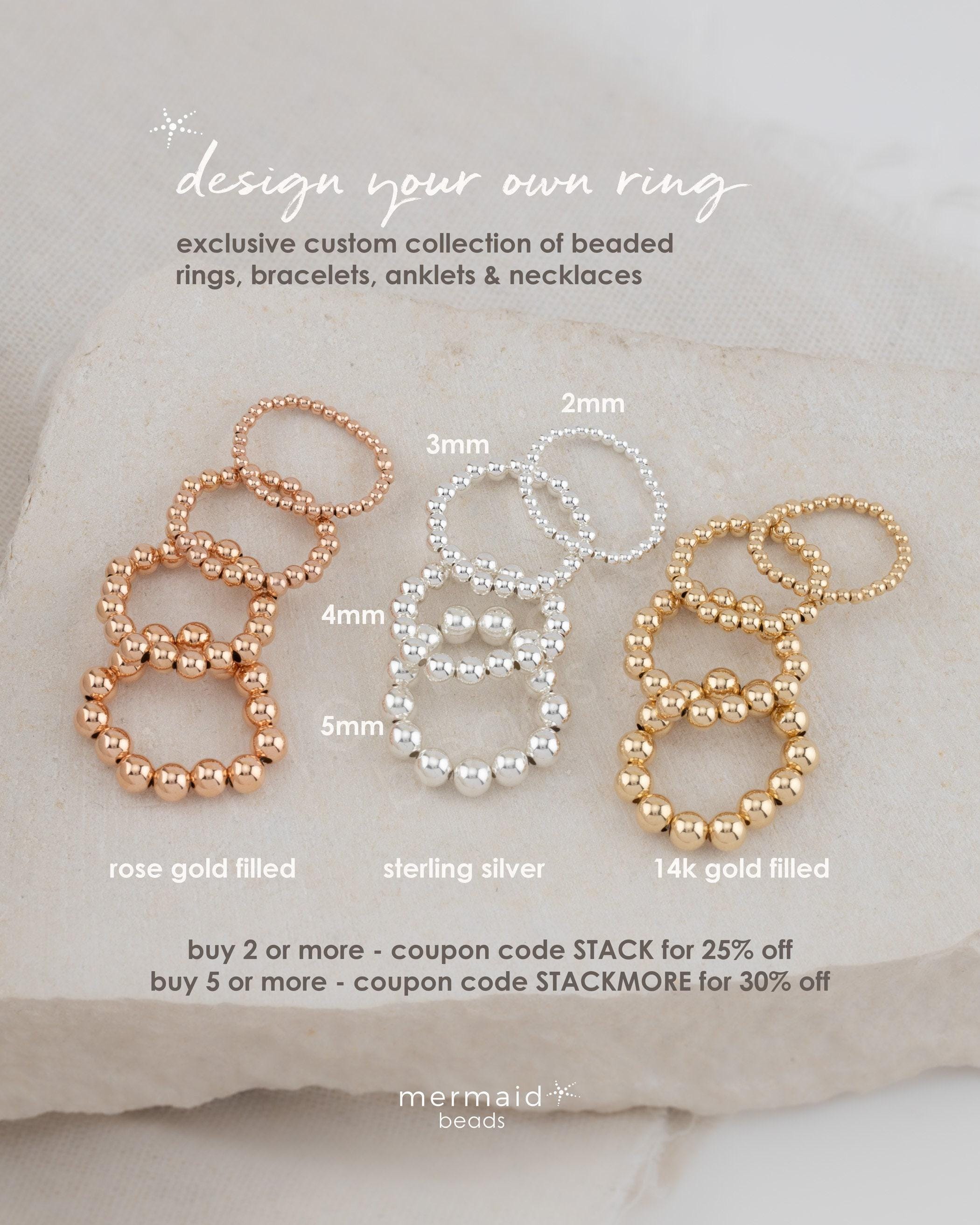 Discover the effortless charm of our stackable stretch rings, designed to bring a touch of elegance to your everyday look. Crafted with care, these beaded rings are hand strung using your choice of 14k gold-filled, rose gold-filled or .925 sterling silver beads. Perfect for creating your own unique ring stack. Our rings can be worn as traditional rings, thumb rings, midi rings or toe rings. Inspired by beach vibes and timeless style, each ring is made to be waterproof and durable, so you can wear them wherever life takes you.