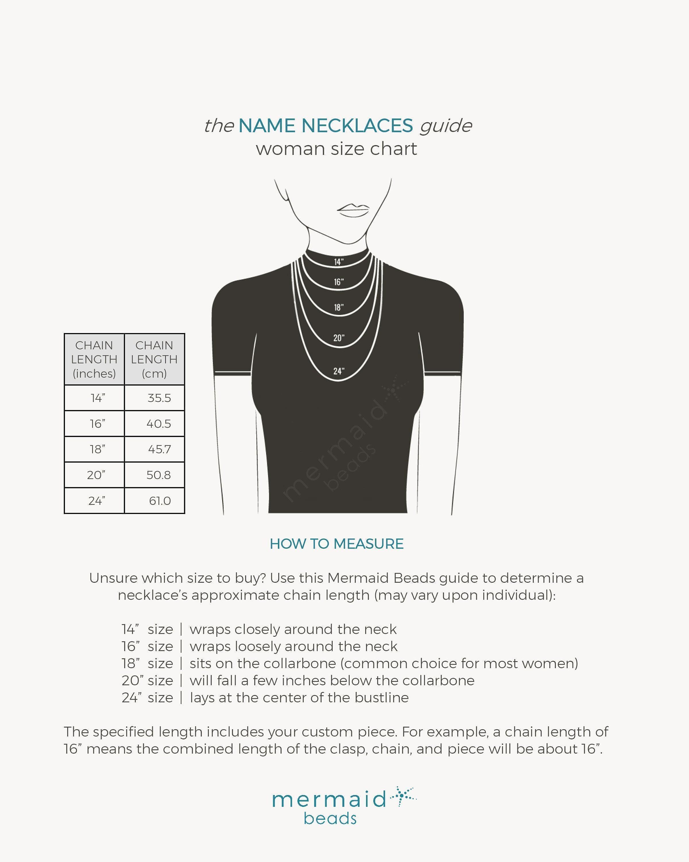 Our necklaces are handmade just for you. To select the perfect fit, scroll through the images to view our Name Necklaces Size Chart. If you're unsure which length to order, here's a simple method to help you find the perfect length: