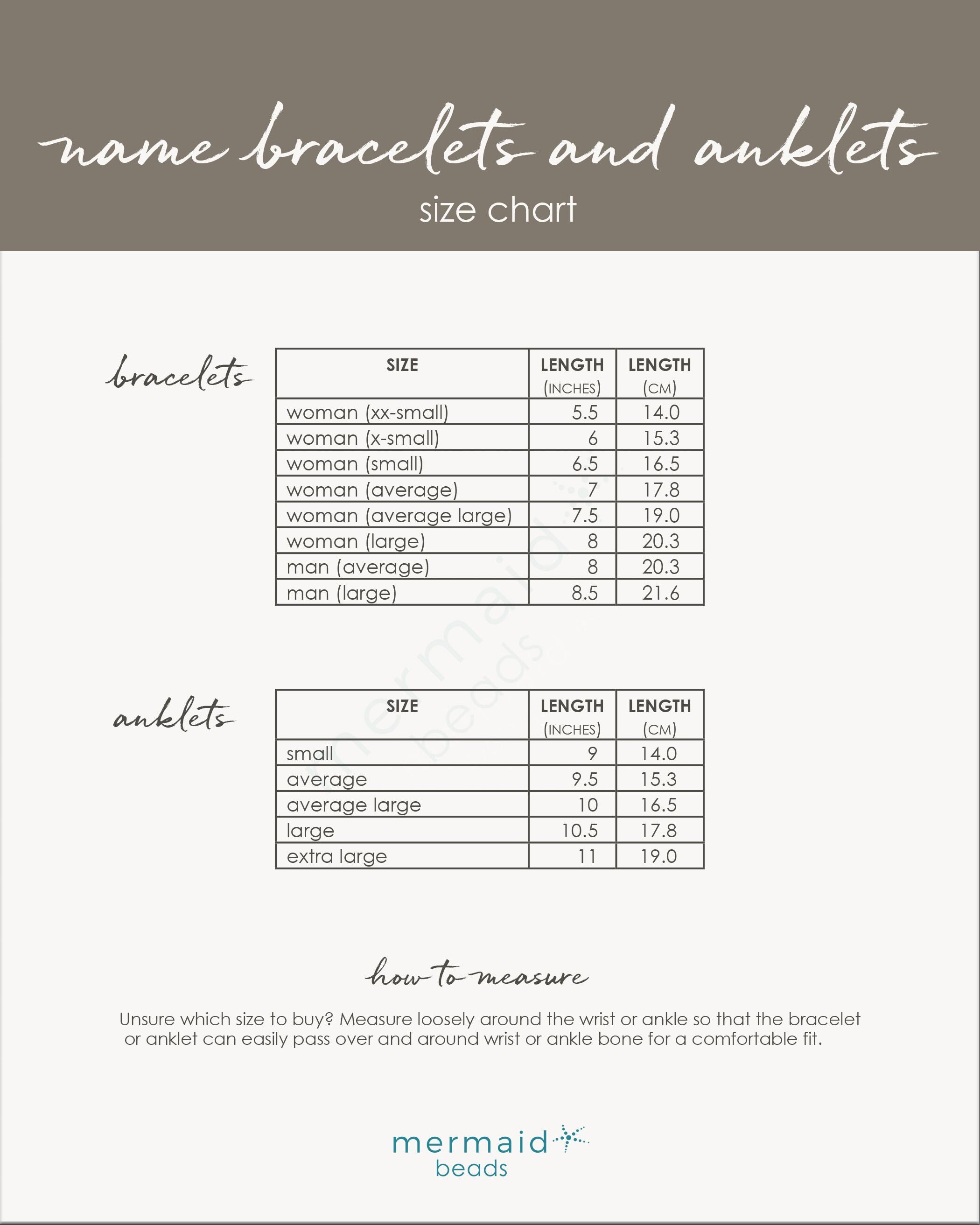 Our bracelets and anklets are handmade just for you. To select the perfect fit, scroll through the images to view our Name Bracelets and Anklets Size Chart. The following further explains how to measure your wrist or ankle size: