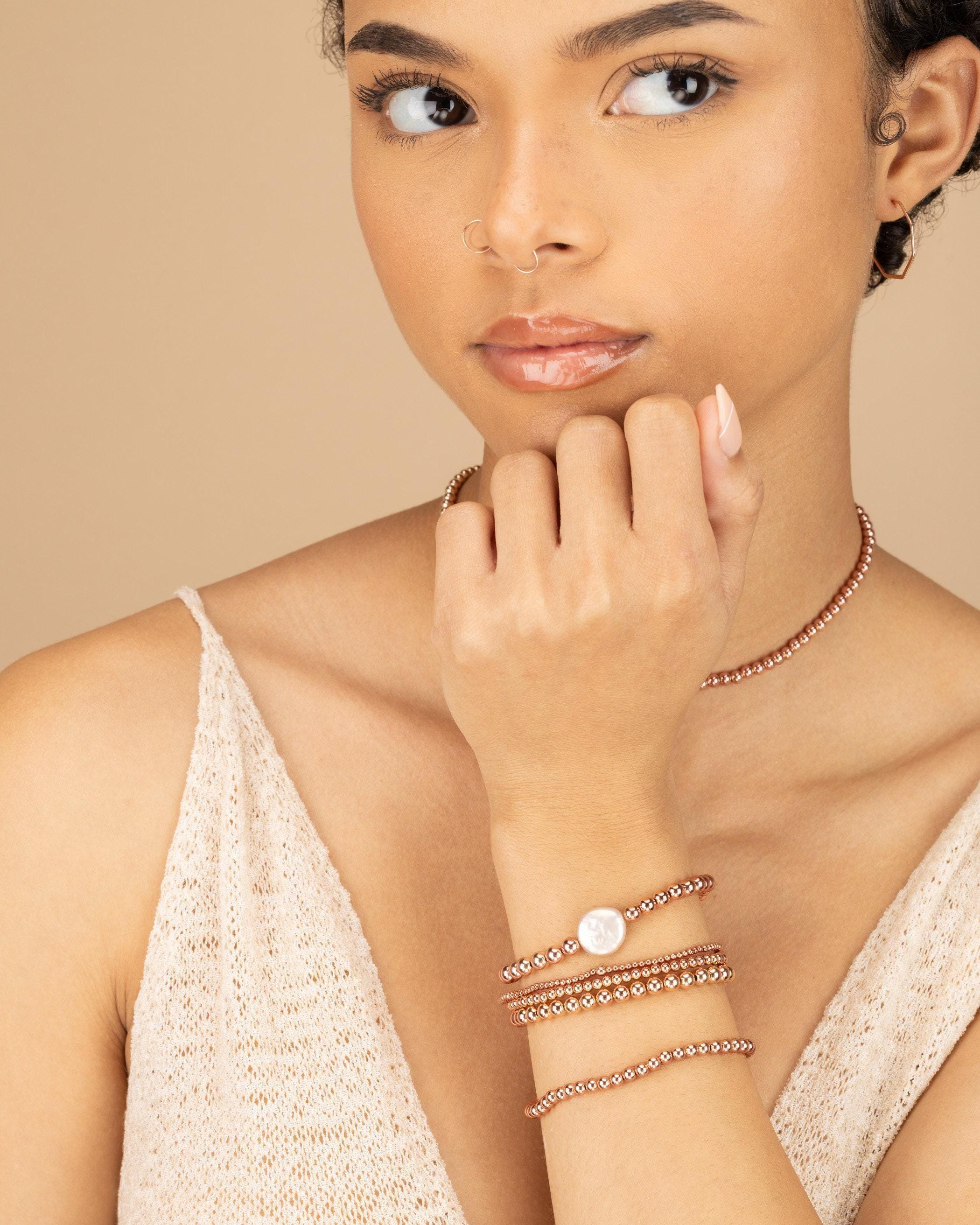 Our precious metal beaded bracelets and anklets are hand-strung on strong stretch cord featuring a genuine Coin Pearl. Coin pearls are unique cultured pearls that are round and flat in shape. They are known for their high luster and iridescent coloration featuring beautiful pink, white, cream and gold hues.