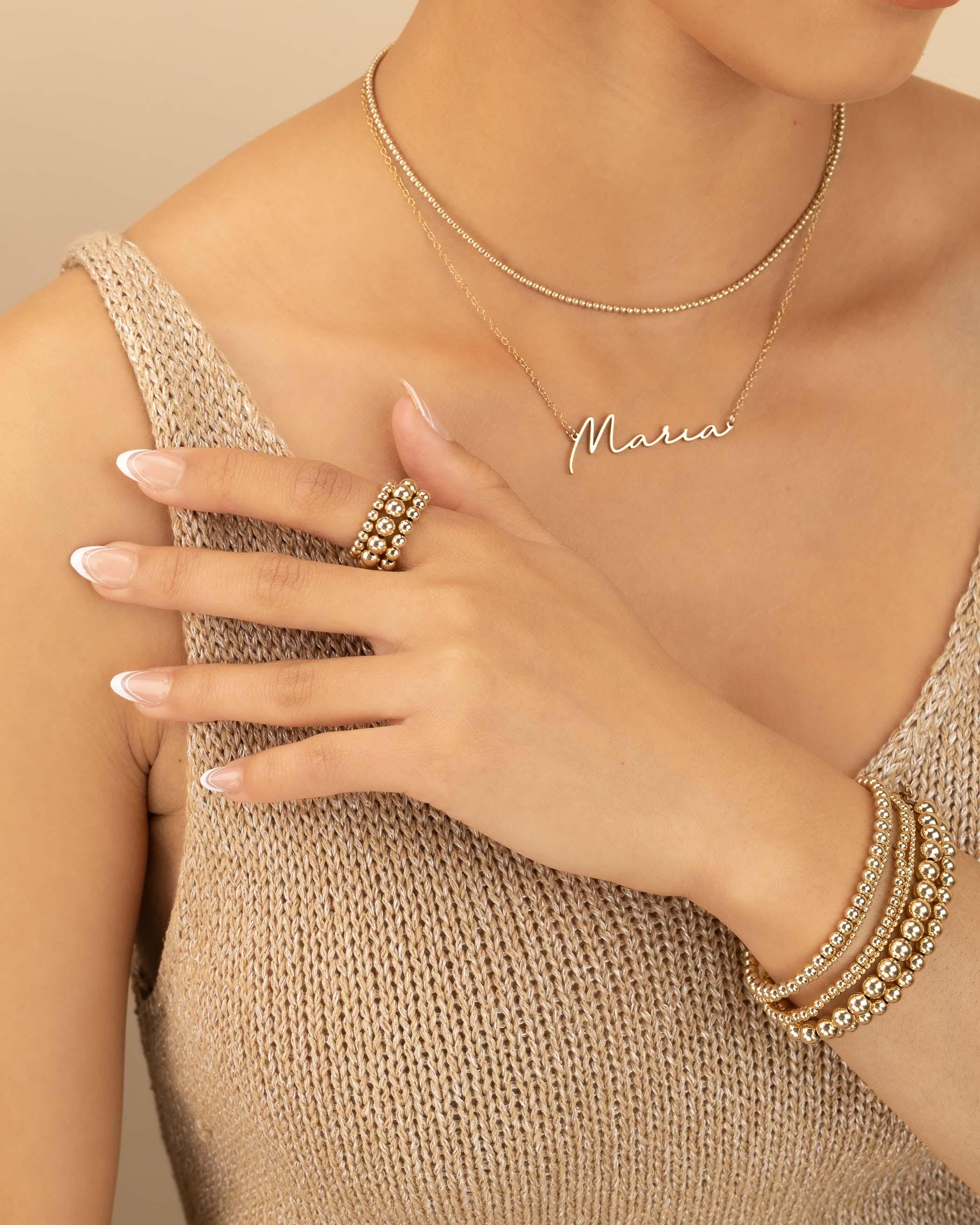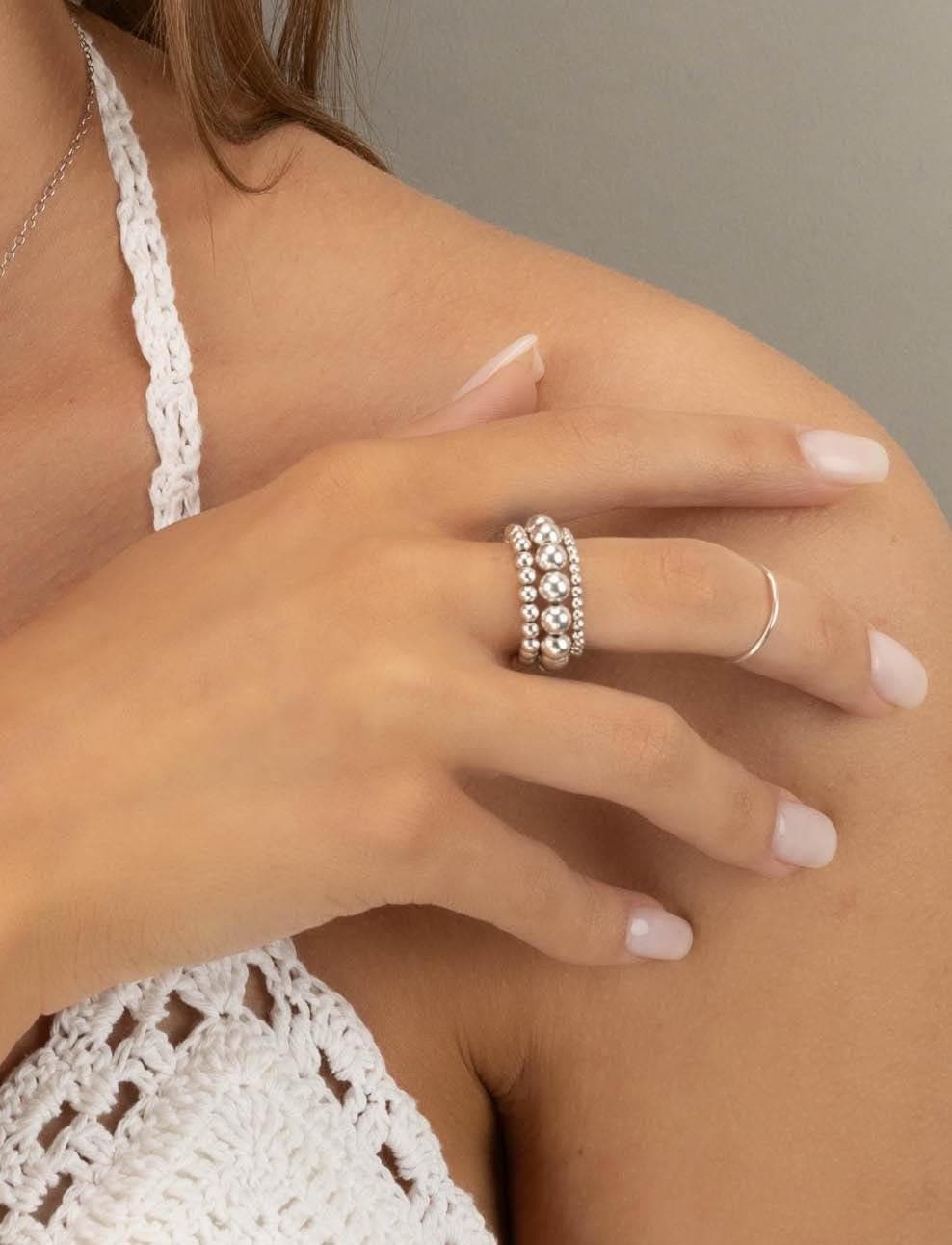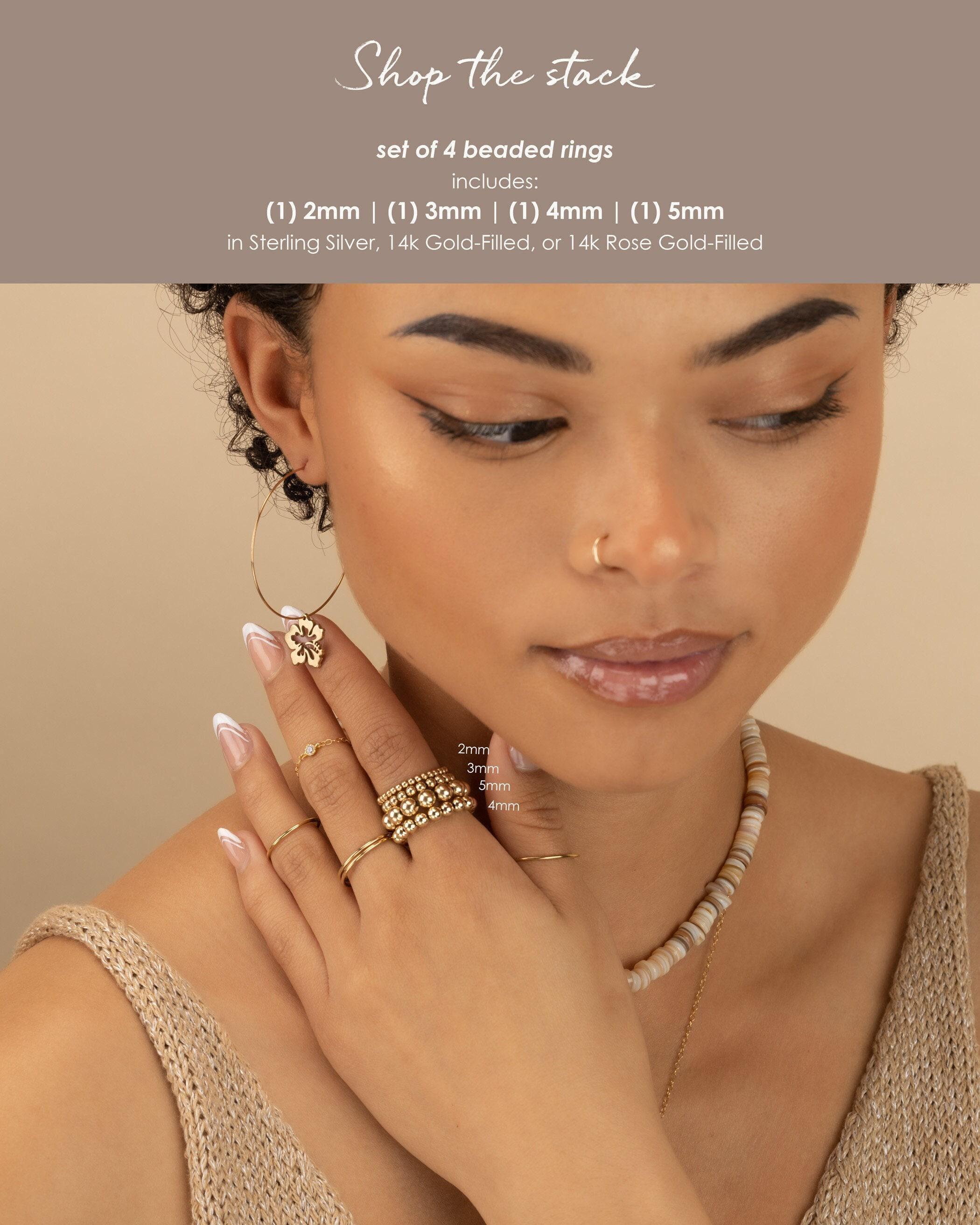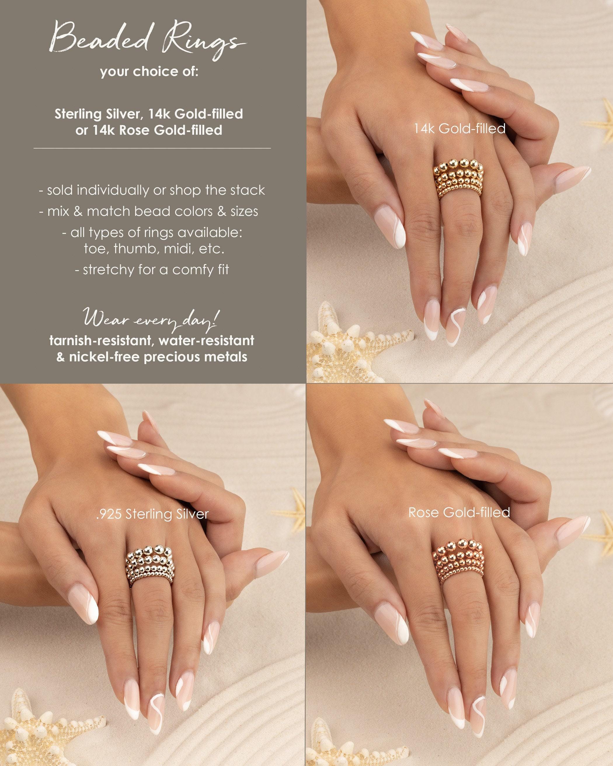 Discover the effortless charm of our stackable stretch rings, designed to bring a touch of elegance to your everyday look. Crafted with care, these beaded rings are hand strung using your choice of 14k gold-filled, rose gold-filled or .925 sterling silver beads. Perfect for creating your own unique ring stack. Our rings can be worn as traditional rings, thumb rings, midi rings or toe rings. Inspired by beach vibes and timeless style, each ring is made to be waterproof and durable, so you can wear them wherever life takes you.