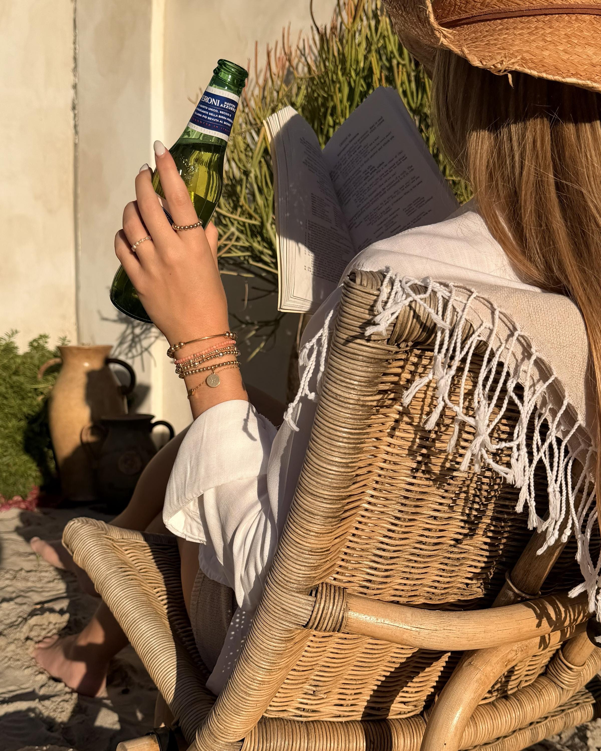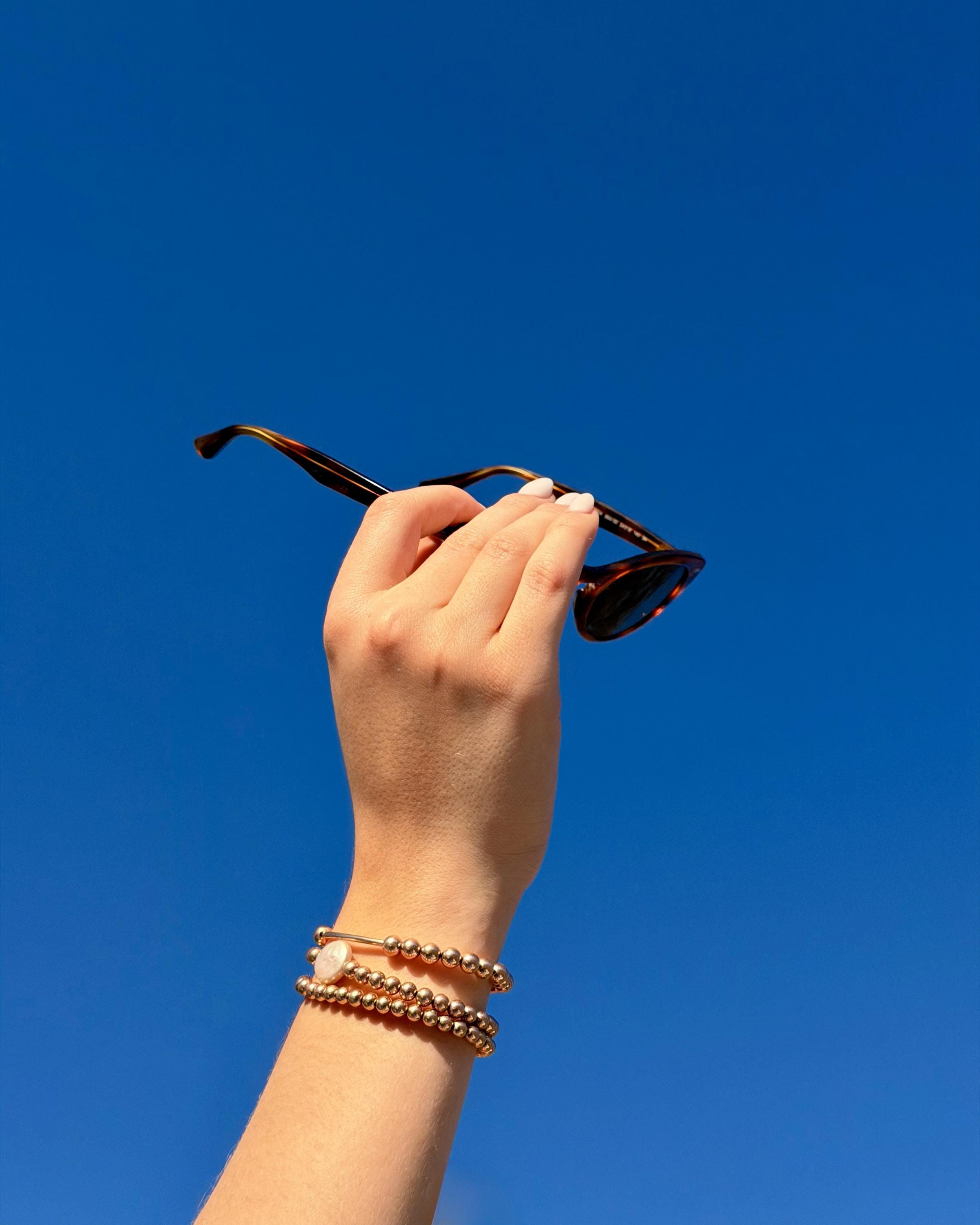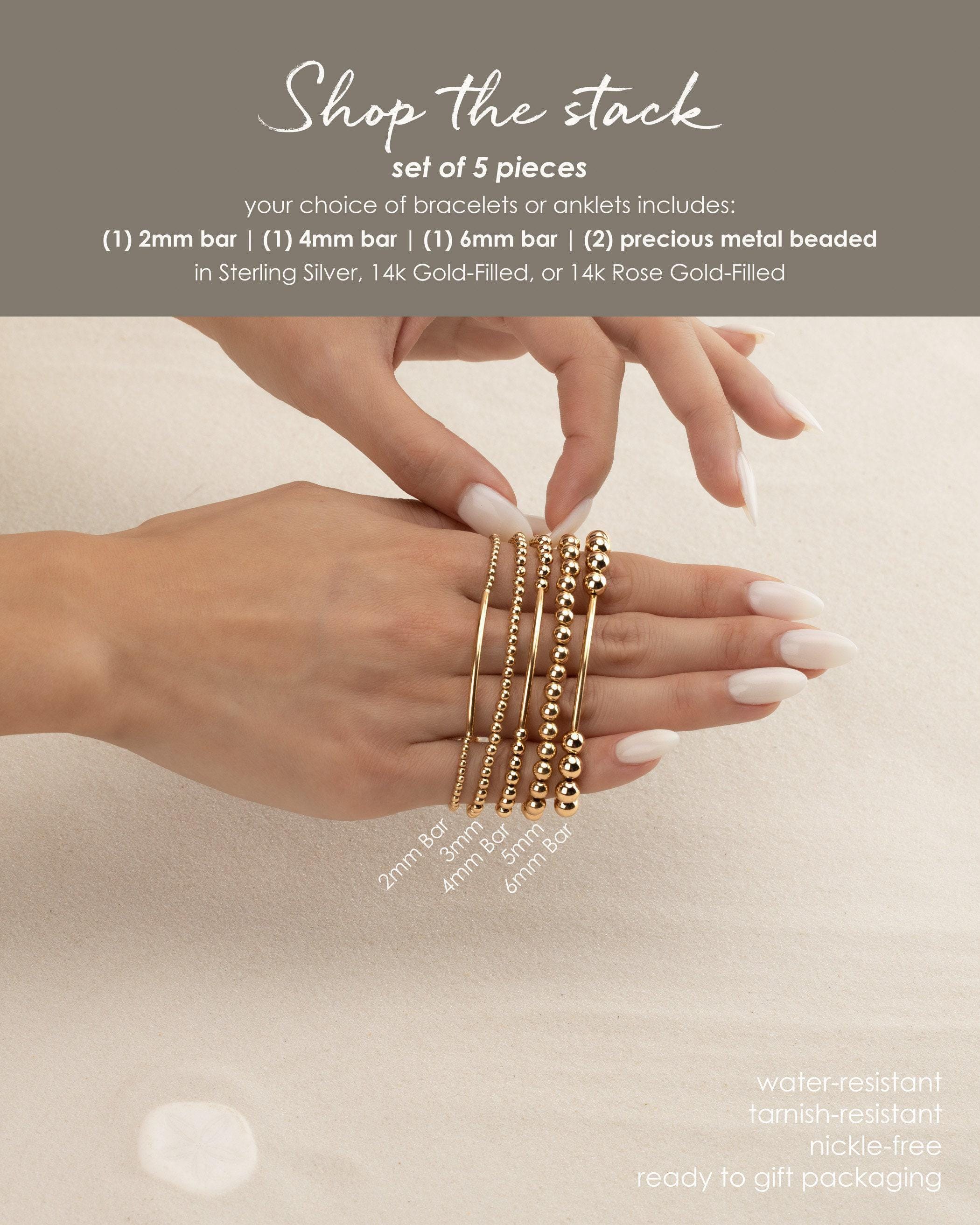 Catch the light of a sunset with our signature curved bar beaded bracelet or anklet. Designed for those who live for the sand and sea, this shimmering bar adds just the right amount of "extra" to your favorite jewelry stack. Hand-strung on durable, high-quality jeweler's stretch cord, it’s the effortless luxury you’ve been looking for.