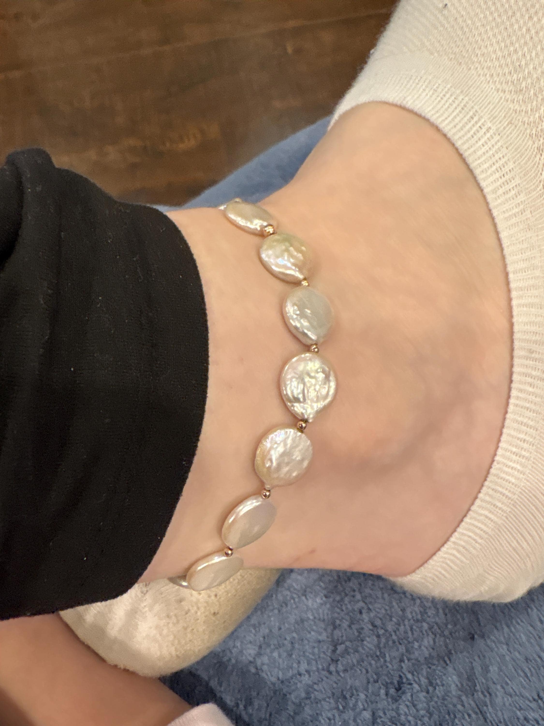 Our coin pearl beaded bracelets and anklets are hand-strung on strong stretch cord featuring your choice of 14k gold filled, Sterling Silver or Rose Gold Filled in between the pearls. Coin pearls are unique cultured pearls that are round and flat in shape. They are known for their high luster and iridescent coloration featuring beautiful pink, white, cream and gold hues.