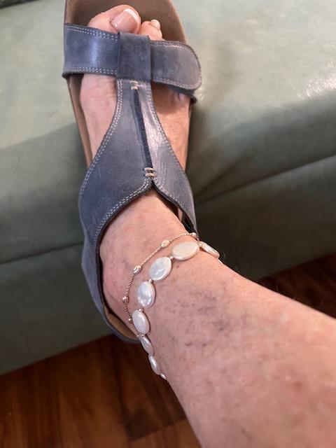 I drooled over this anklet online forever - finally couldn't stand it and hit the order button. How beautiful it is. AND I love that it's stretchy and no latches to mess with. So comfortable. Really love this ankle bracelet!