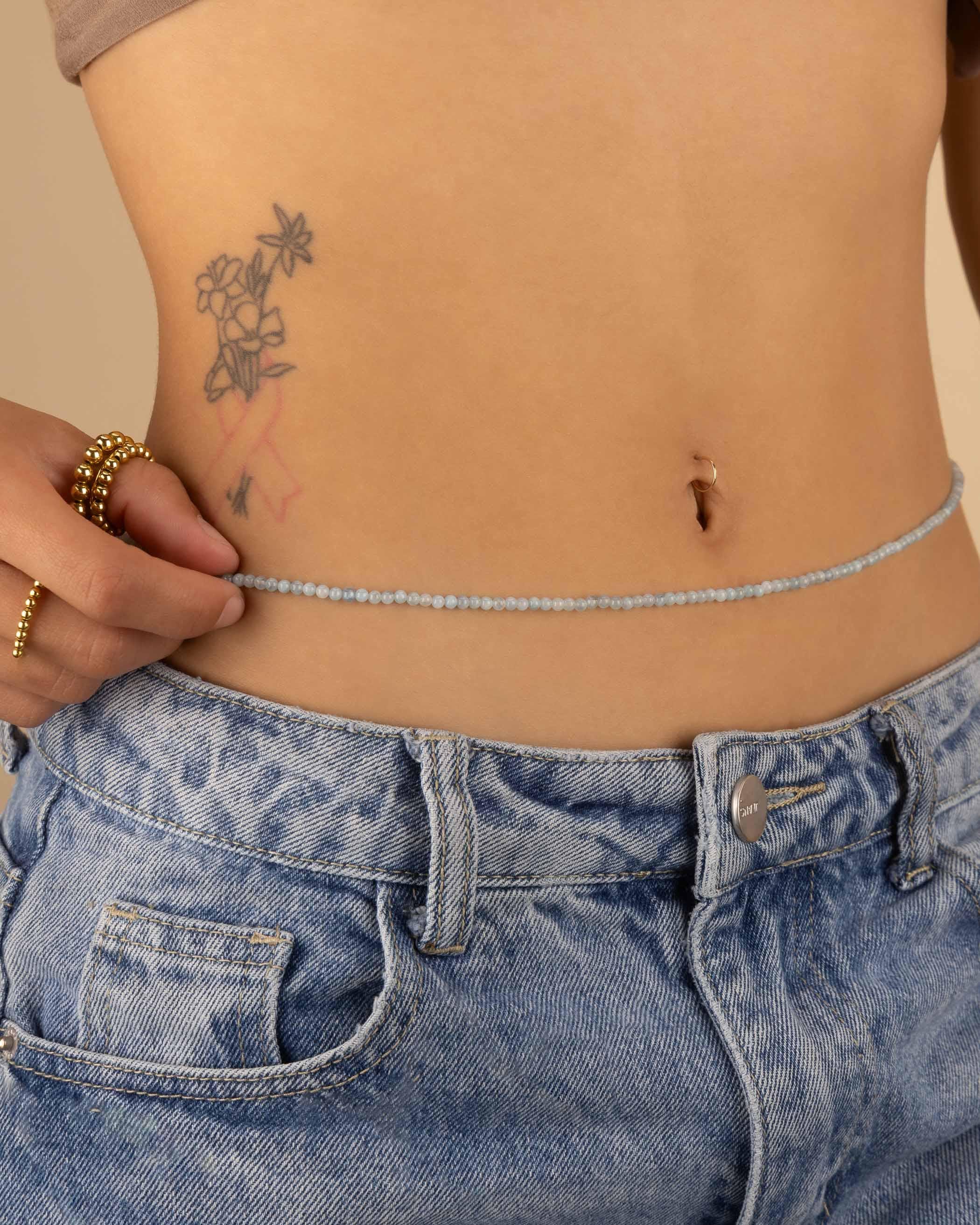 Genuine Aquamarine beaded waist beads handmade in your choice of clasp color and length. These beautiful semi-precious gemstone beads are hand-strung on high-quality jeweler's wire and completed with an Italian made clasp and pretty extender chain with our Mermaid Beads starfish charm.