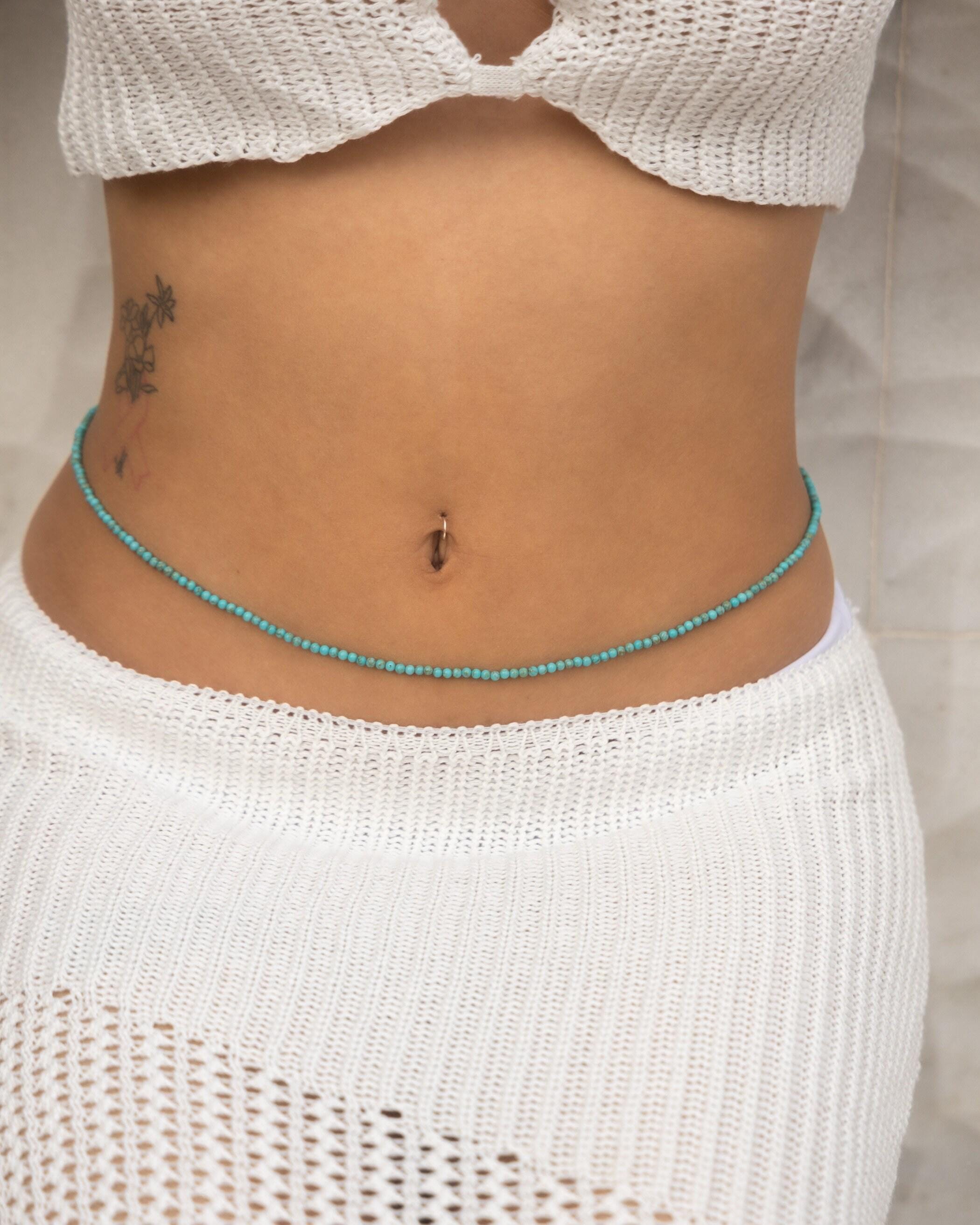 Genuine 3mm Turquoise beaded waist beads handmade in your choice of clasp color and length. These beautiful semi-precious gemstone beads are hand-strung on high-quality jeweler's wire and completed with an Italian made clasp and pretty extender chain with our Mermaid Beads starfish charm.
