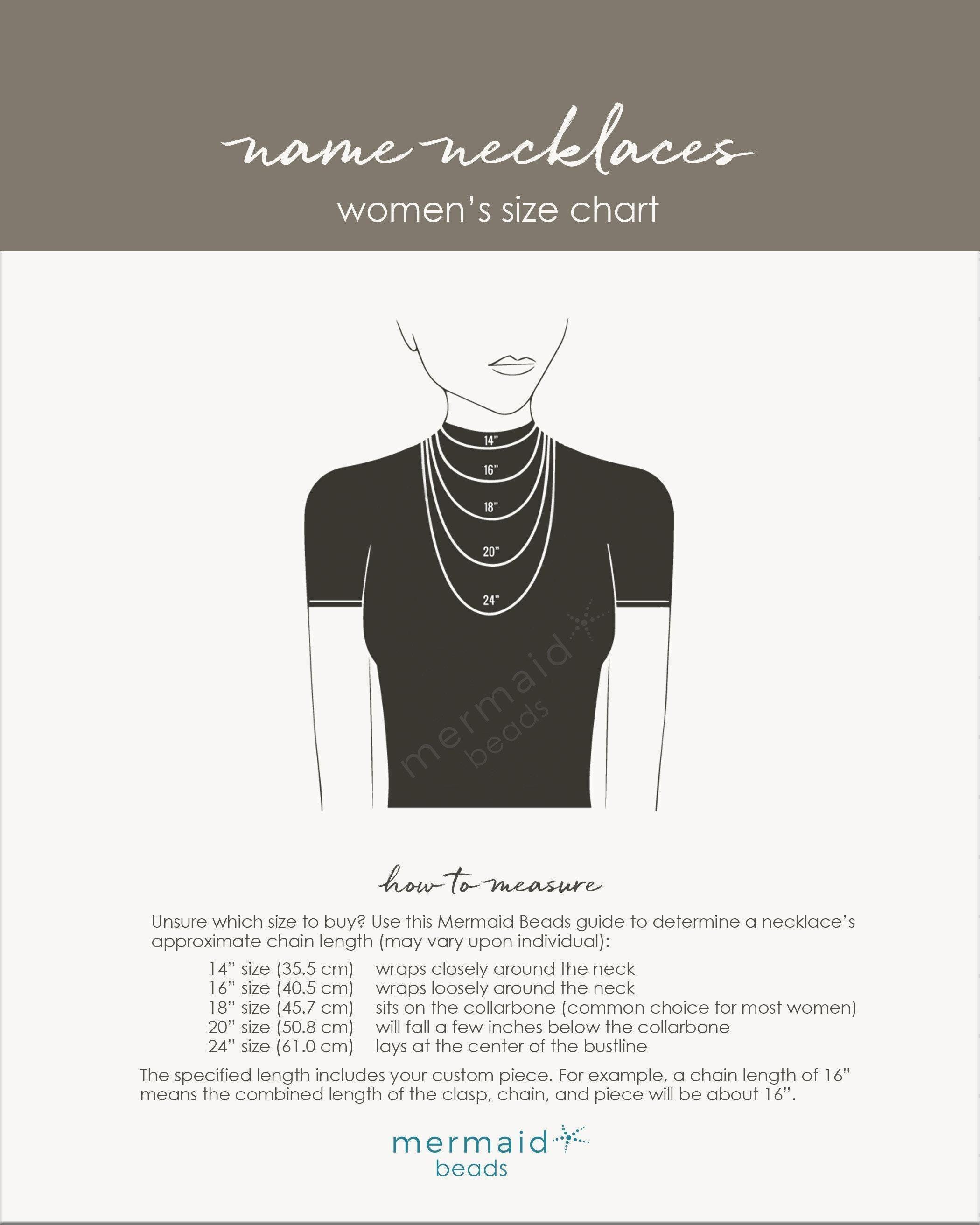 Our necklaces are handmade just for you. To select the perfect fit, scroll through the images to view our Name Necklaces Size Chart. If you're unsure which length to order, here's a simple method to help you find the perfect length: