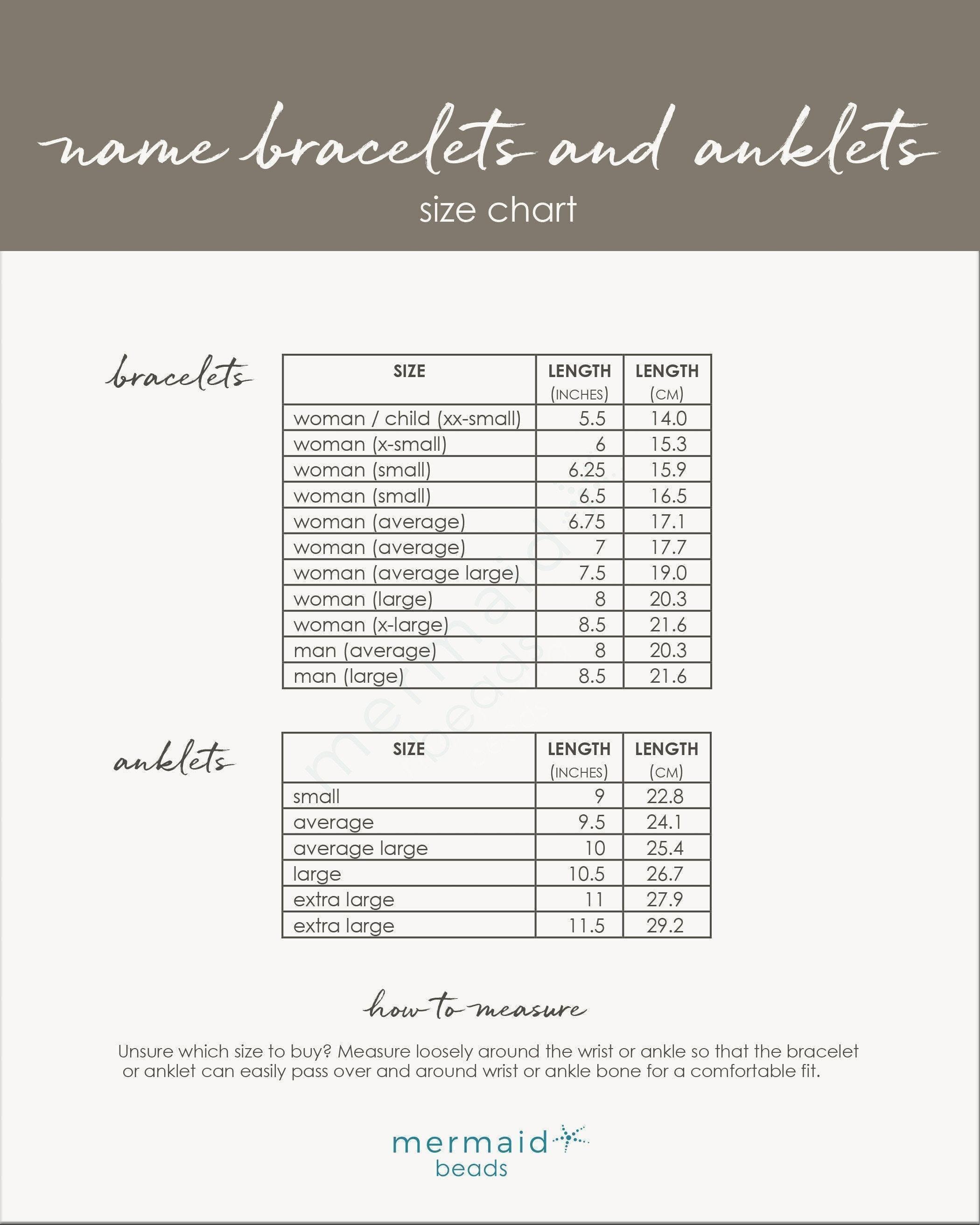 Our bracelets and anklets are handmade just for you. To select the perfect fit, scroll through the images to view our Name Bracelets and Anklets Size Chart. The following further explains how to measure your wrist or ankle size: