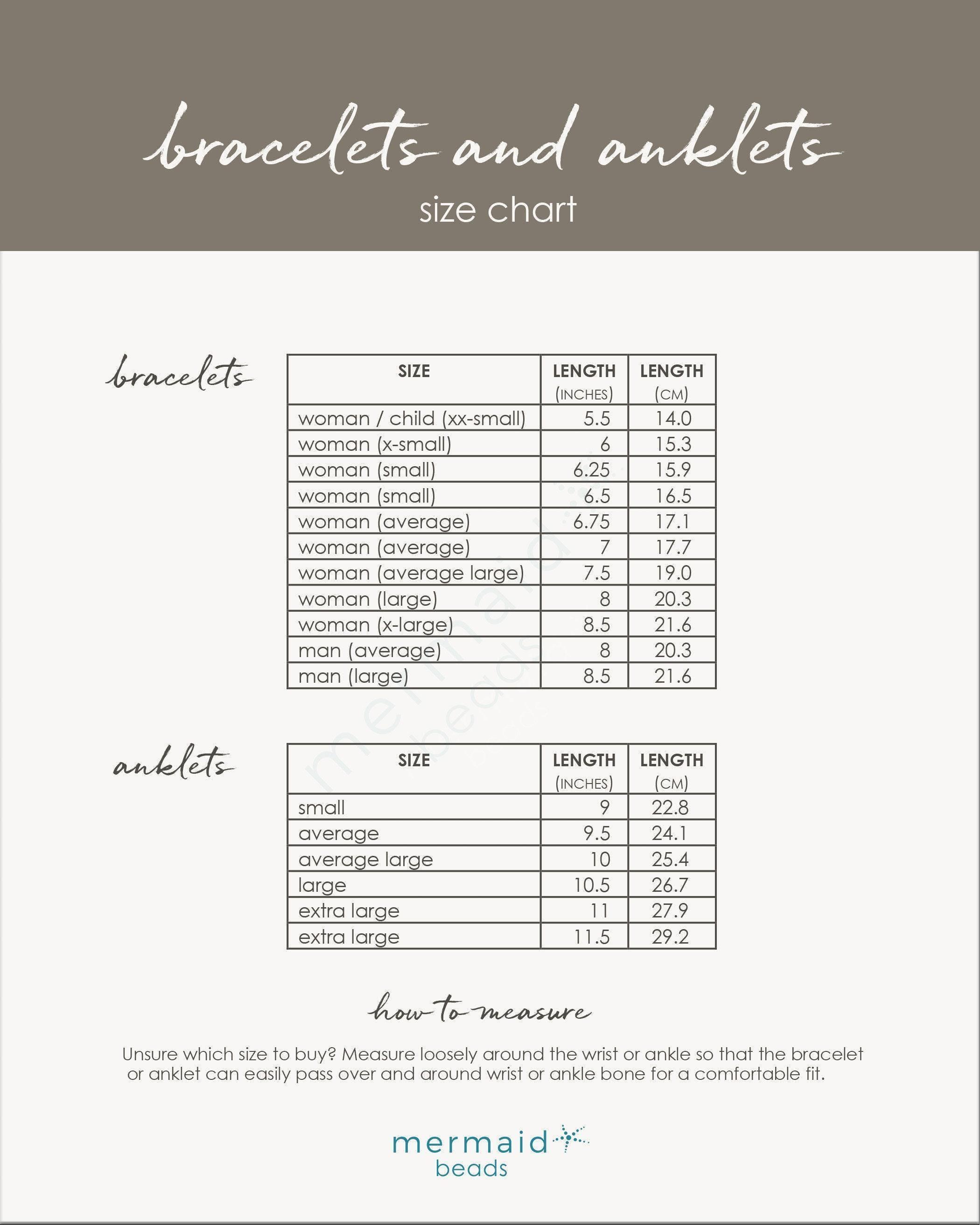 Our bracelets and anklets are handmade just for you. To select the perfect fit, scroll through the images to view our Bracelets and Anklets Size Chart. The following further explains how to measure your wrist or ankle size: