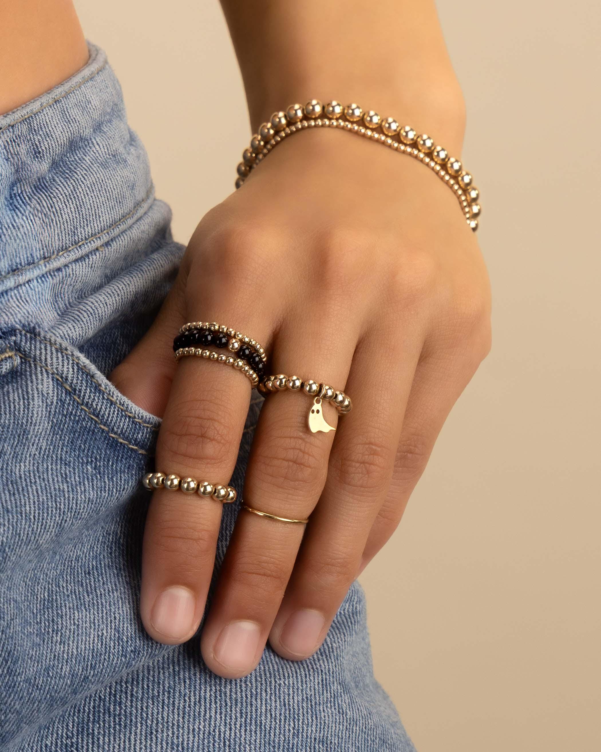 Discover the effortless charm of our stackable stretch rings, designed to bring a touch of elegance to your everyday look. Crafted with care, these beaded rings are hand strung using your choice of 14k gold-filled, rose gold-filled or .925 sterling silver beads. Perfect for creating your own unique ring stack. Our rings can be worn as traditional rings, thumb rings, midi rings or toe rings. Inspired by beach vibes and timeless style, each ring is made to be waterproof and durable, so you can wear them wherever life takes you.