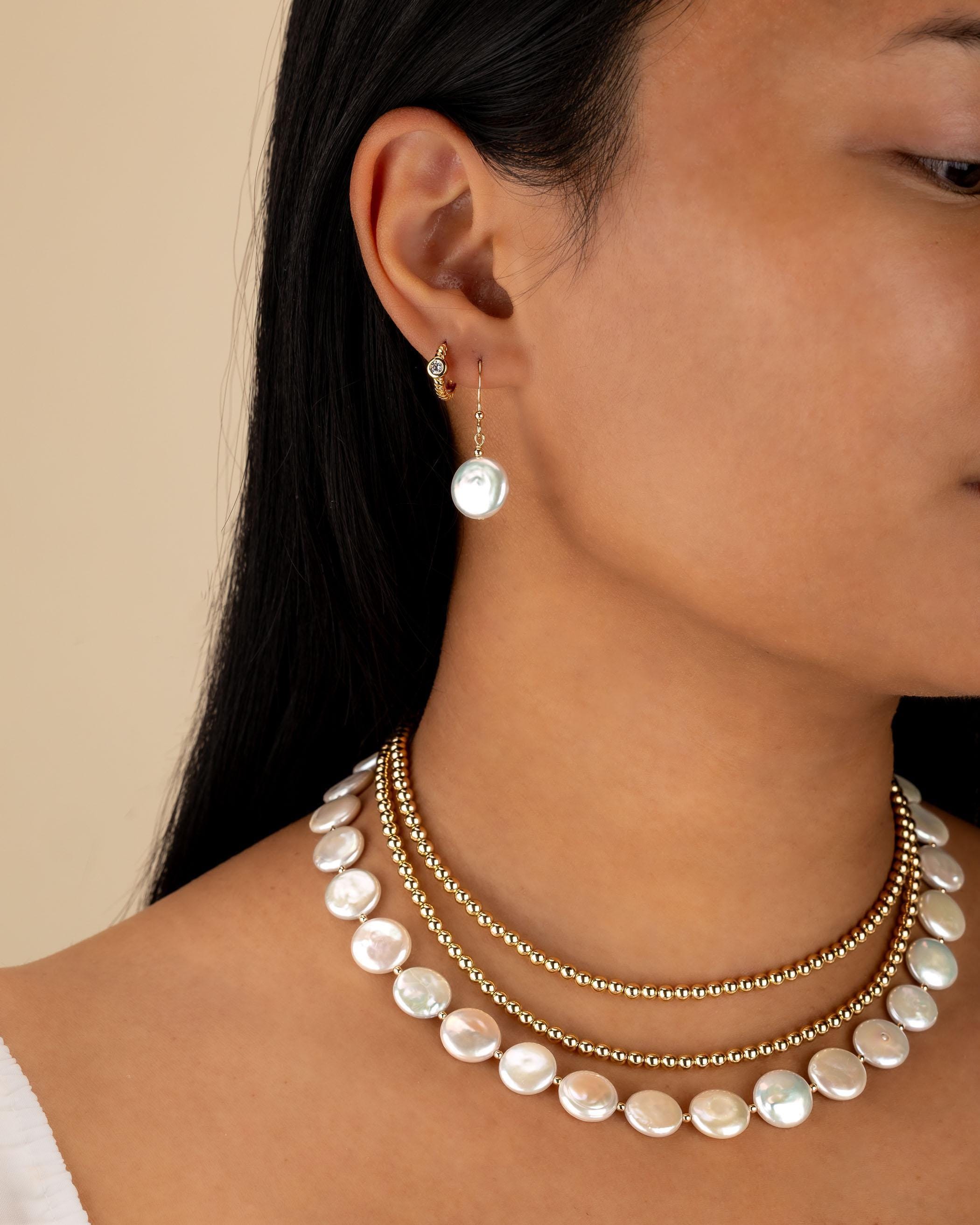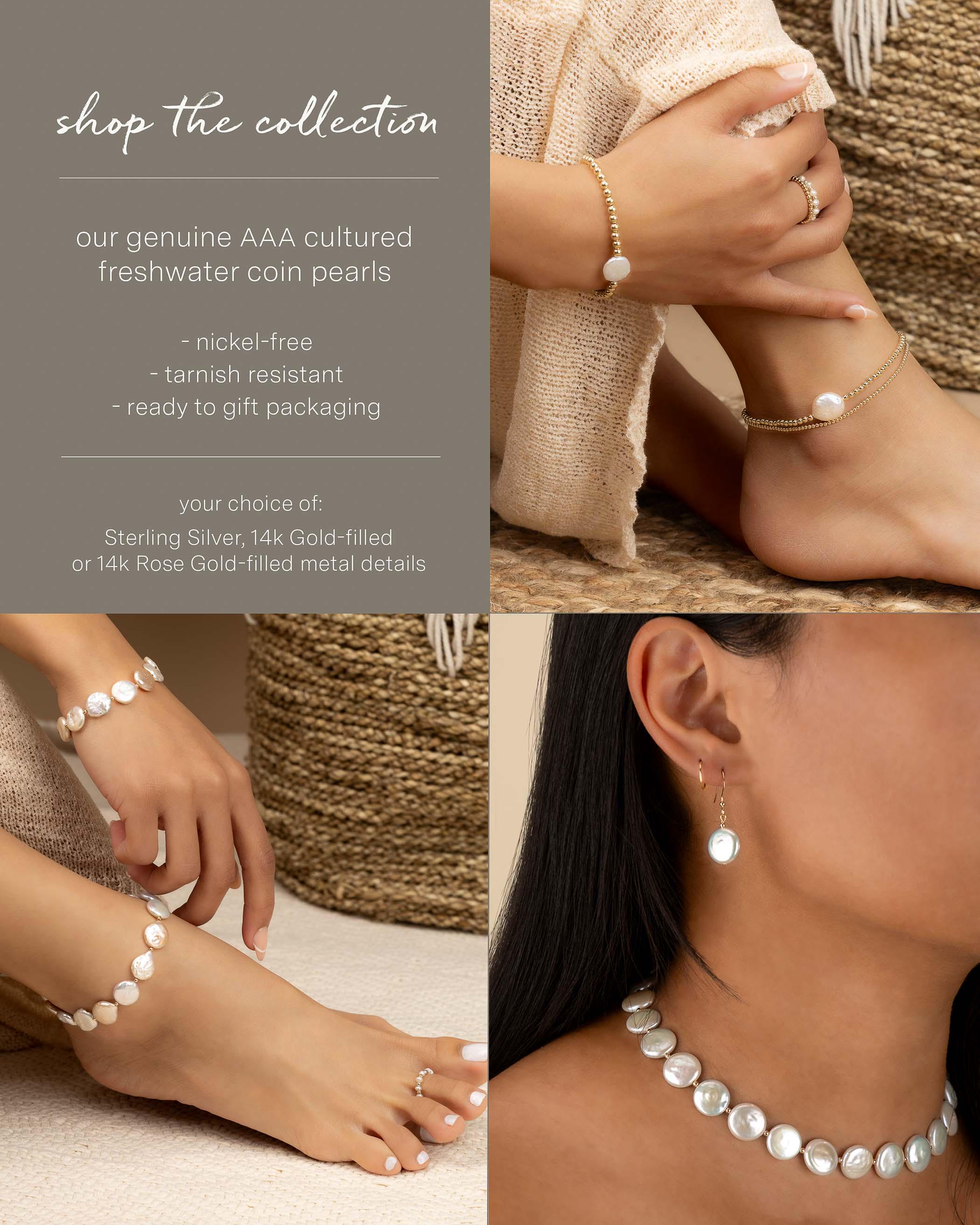 Our beautiful coin pearl beaded necklace is hand-strung featuring your choice of 14k gold filled, .925 Sterling Silver or Rose Gold Filled beads in between each pearl.