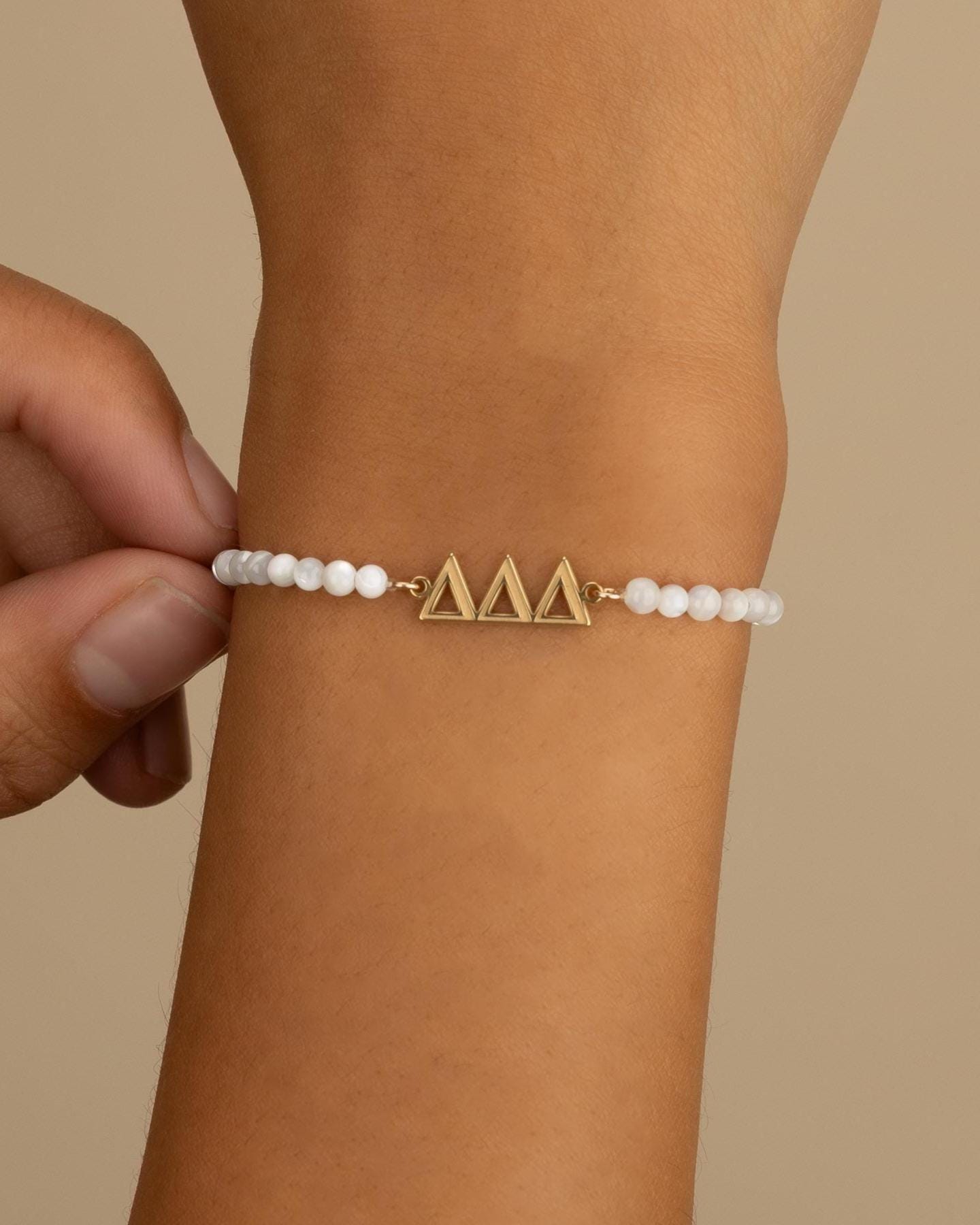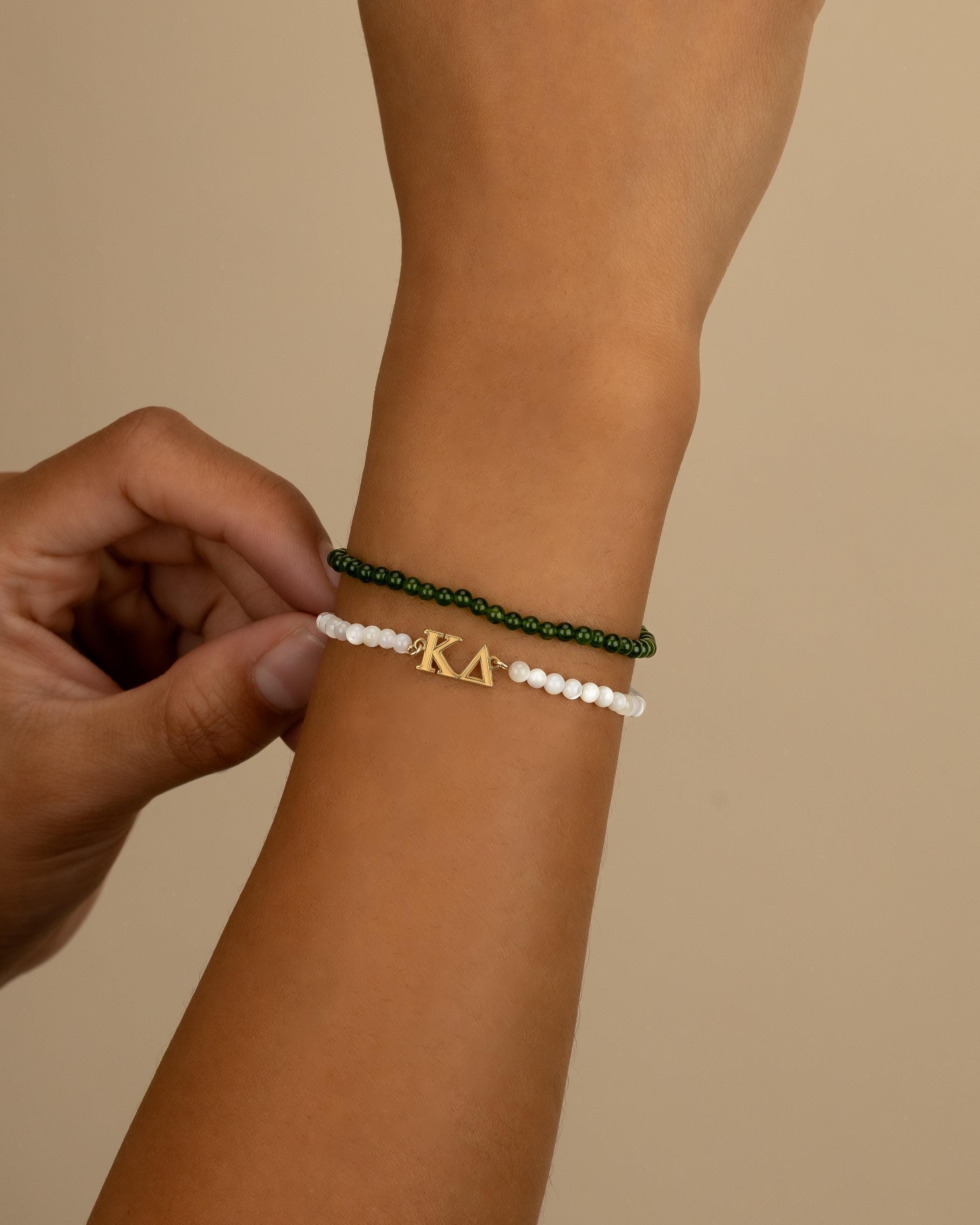 Our custom greek letters charm paired with our beautiful pearl gemstone beaded bracelet or anklet. Wear solo for a delicate statement or layer with other bracelets for a trendy and personalized look that showcases your unique style. All bracelets and anklets are hand-strung on a strong stretch cord - easy and comfy to wear.