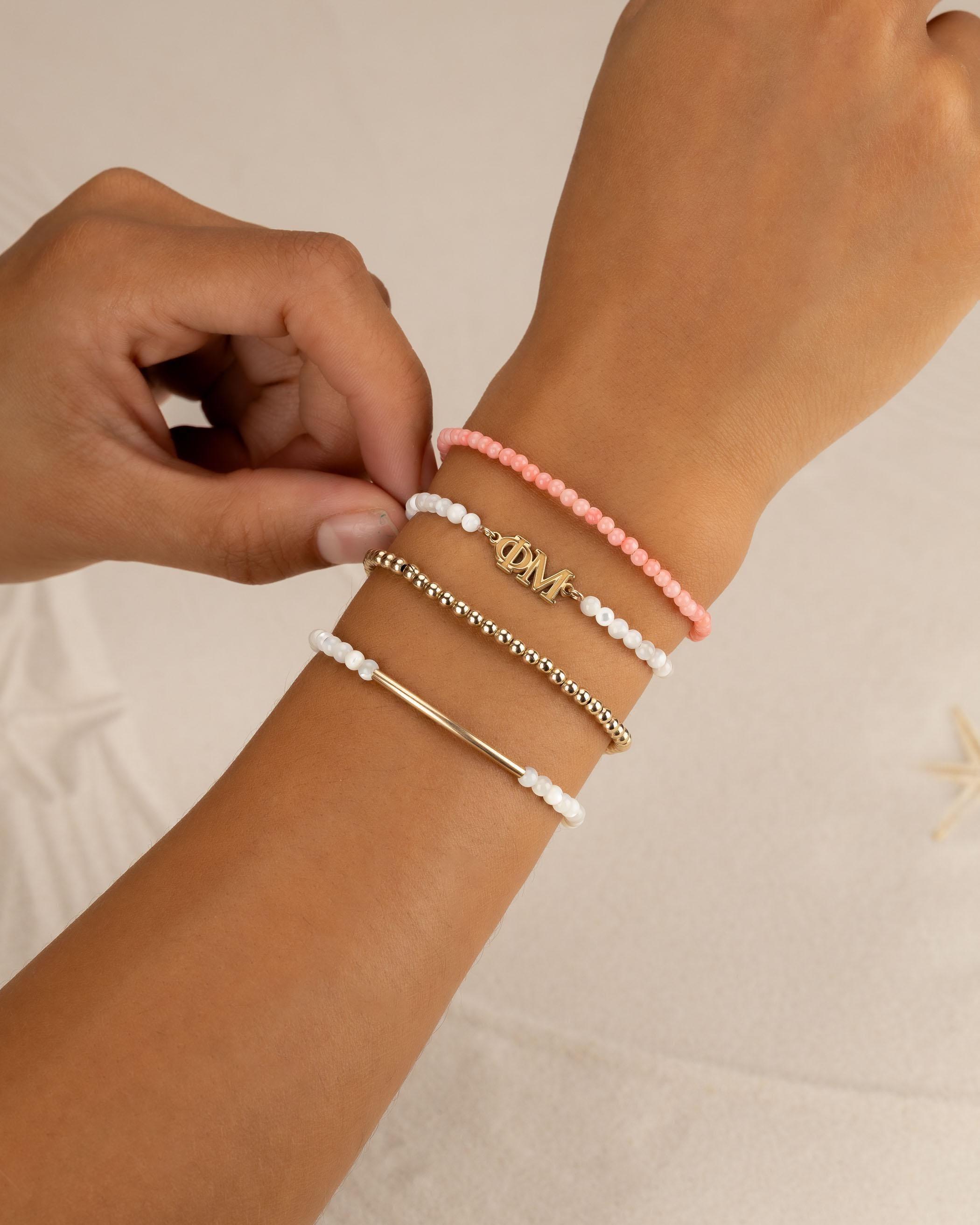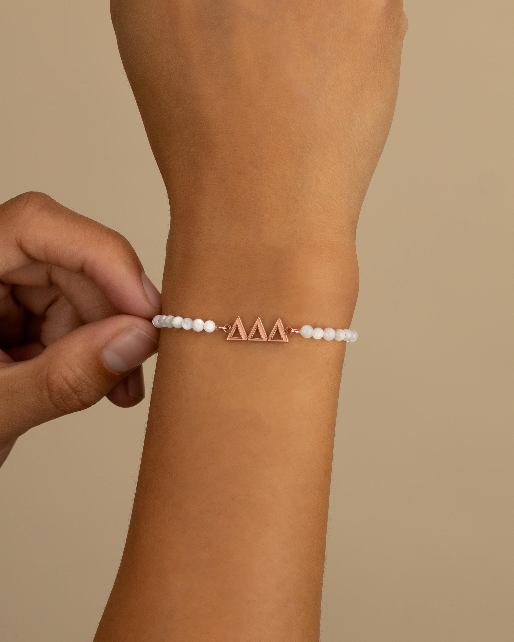 Our custom greek letters charm paired with our beautiful pearl gemstone beaded bracelet or anklet. Wear solo for a delicate statement or layer with other bracelets for a trendy and personalized look that showcases your unique style. All bracelets and anklets are hand-strung on a strong stretch cord - easy and comfy to wear.