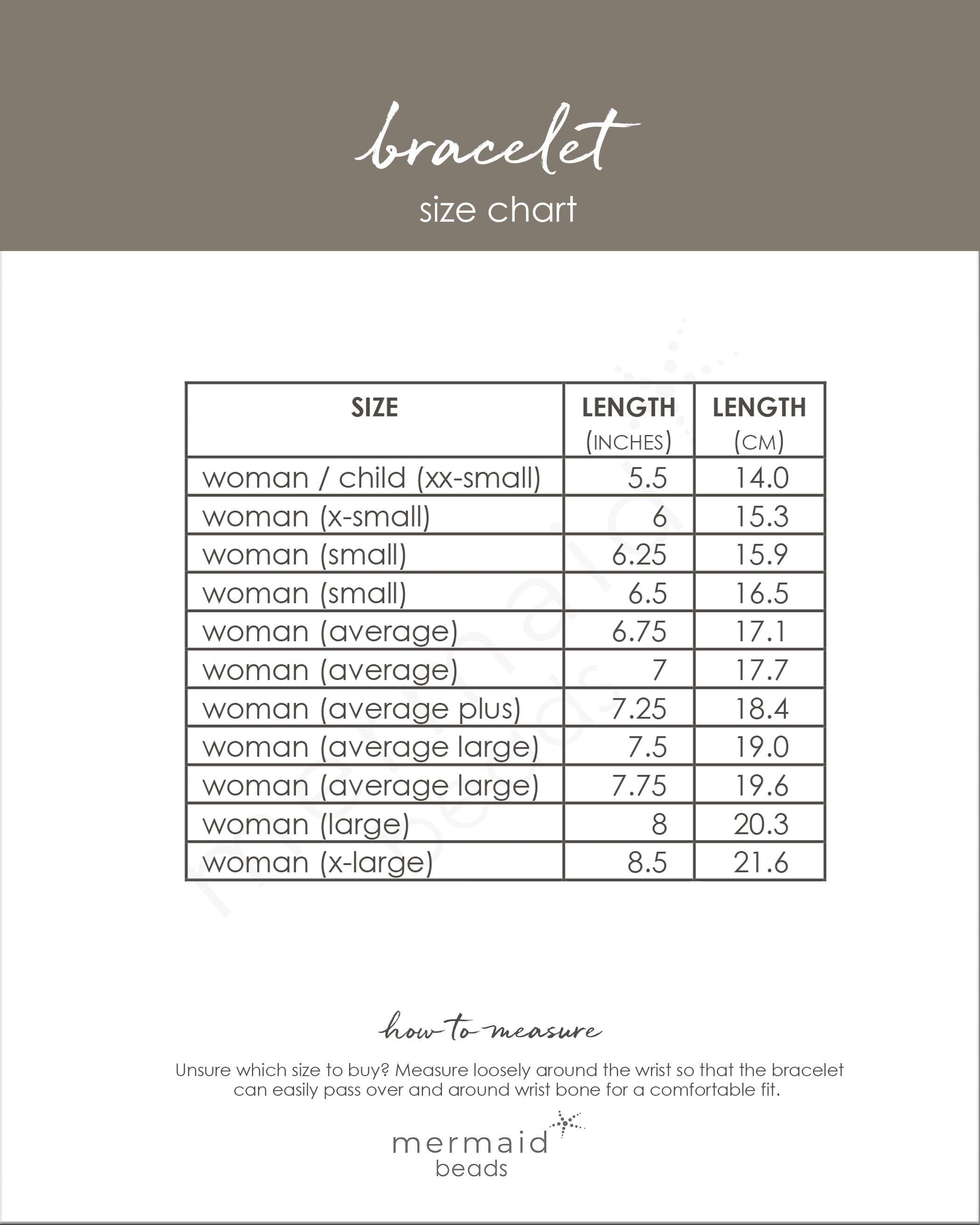 🌴 Simply hold a string or ribbon around your wrist. It should be loose enough so it moves easily around your wrist bone and is comfy and not too tight. Measure the length against a ruler and select that size from the drop down menu.