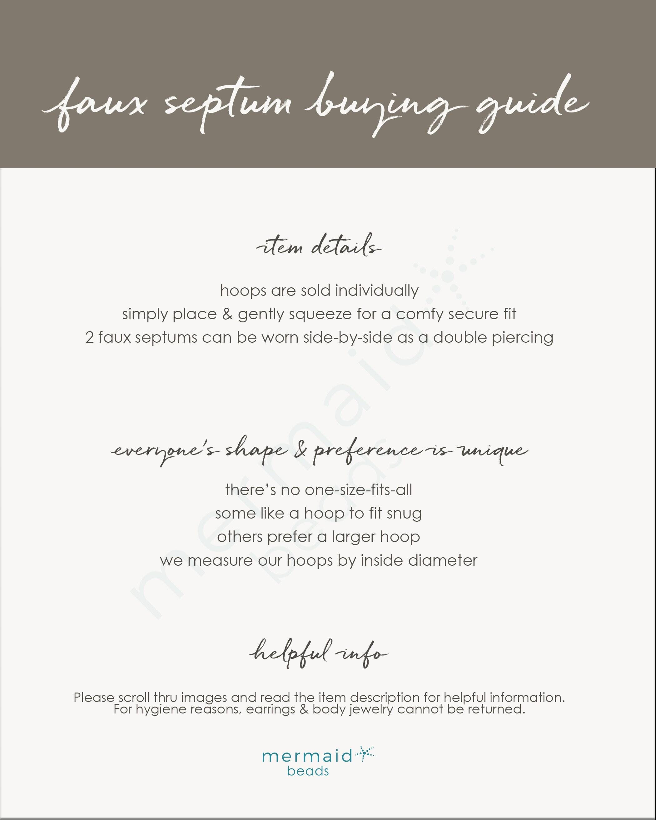 Scroll through the images to view our Faux Septum Hoop Sizing Guide and Faux Septum Hoop Buying Guide. Check our FAQs (frequently asked questions) section below for more information.