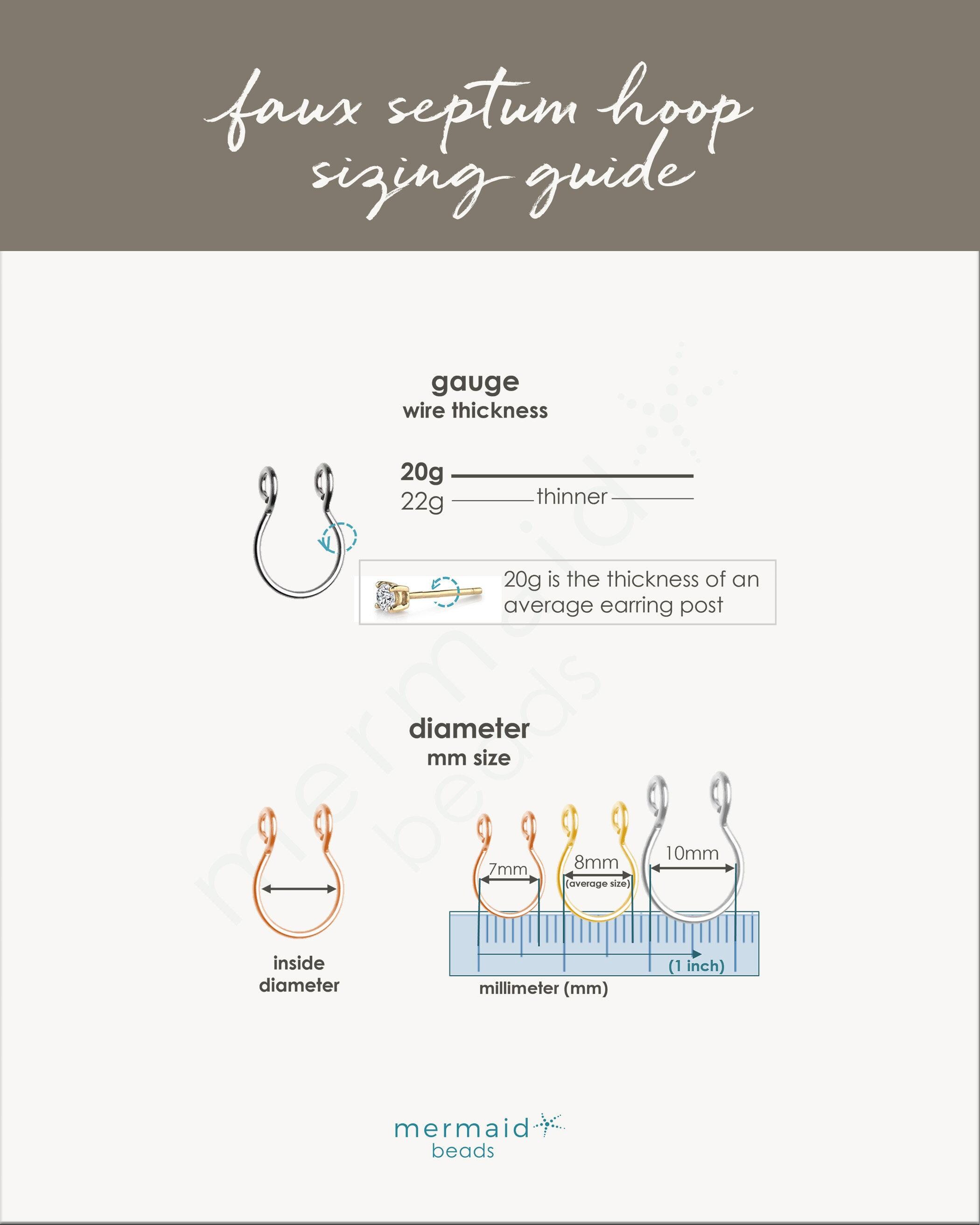 Our faux septum hoops are handmade just for you. You select the perfect size! To ensure the perfect fit, scroll through the images to view our Faux Septum Hoop Size Guide.