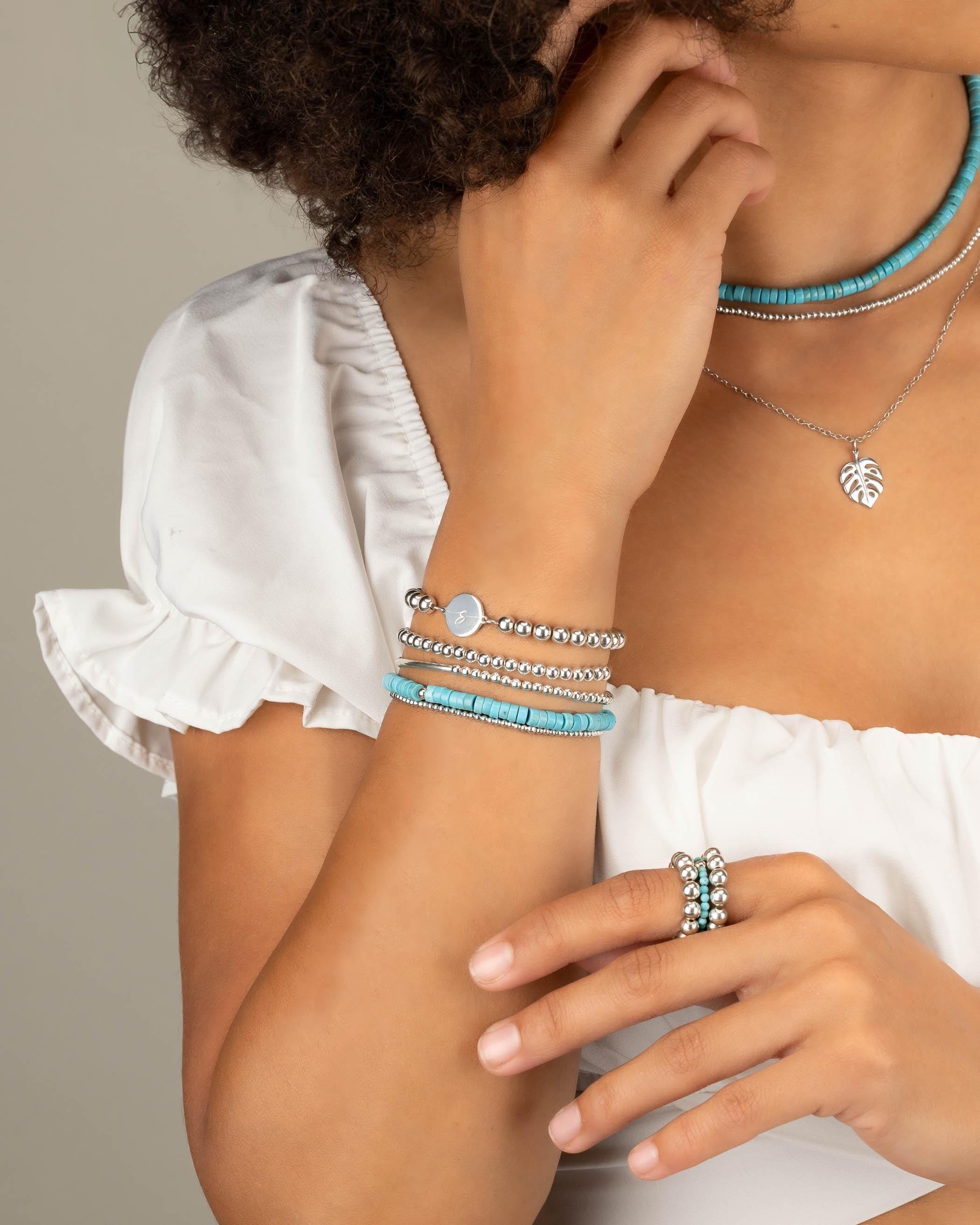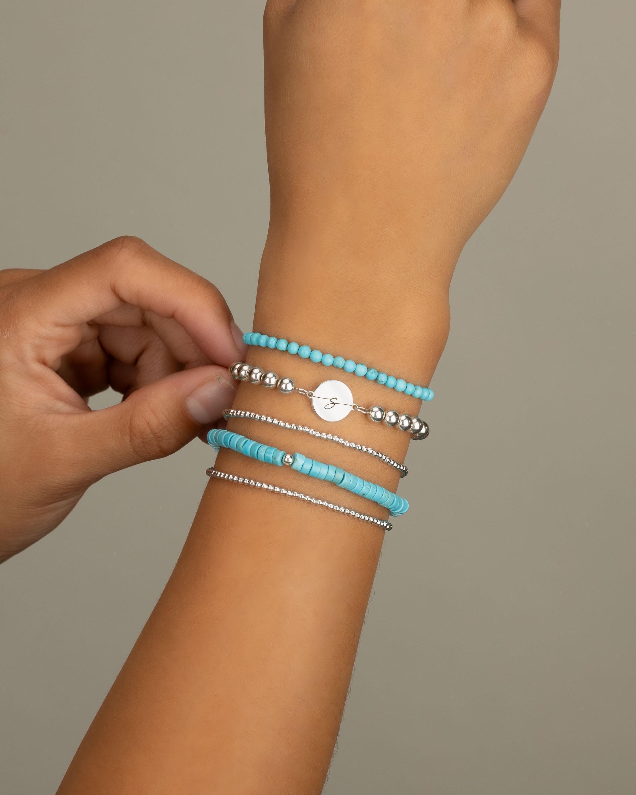 Beautiful inital engraved charm bracelets and anklets with your selected itital. Our precious metal beaded bracelets and anklets are hand-strung on high-quality stretch cord. Mix and match bead sizes & colors for your own unique bracelet or anklet stack.