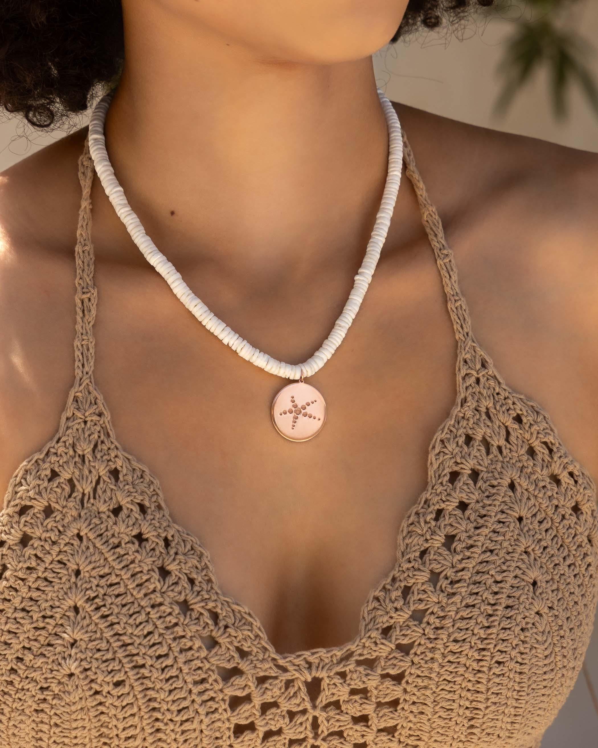 Genuine white shell heishi beaded necklace featuring your choice of our beautiful charm pendants.