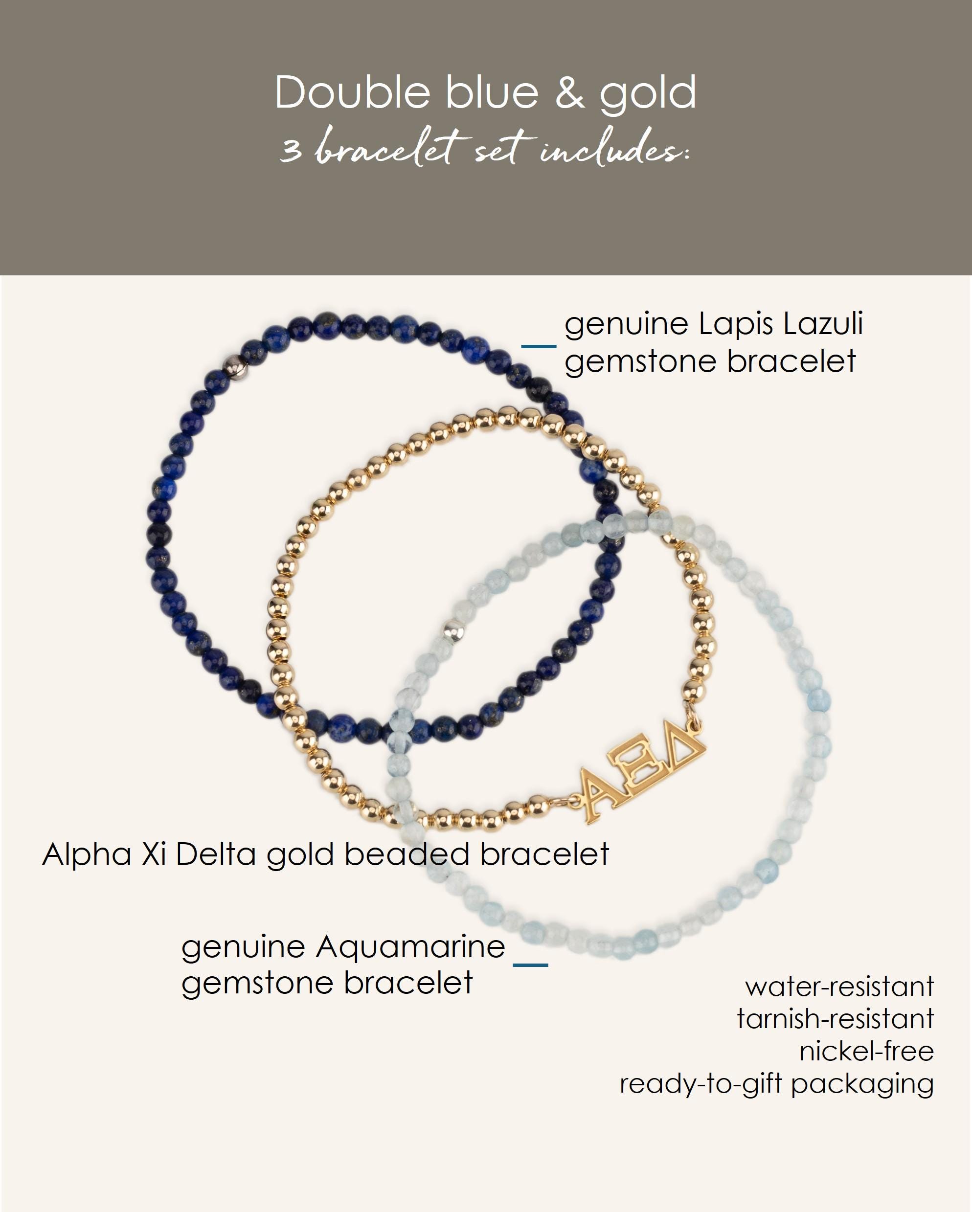 • Paired with 2 genuine gemstone bracelets: Aquamarine and Lapis Lazuli