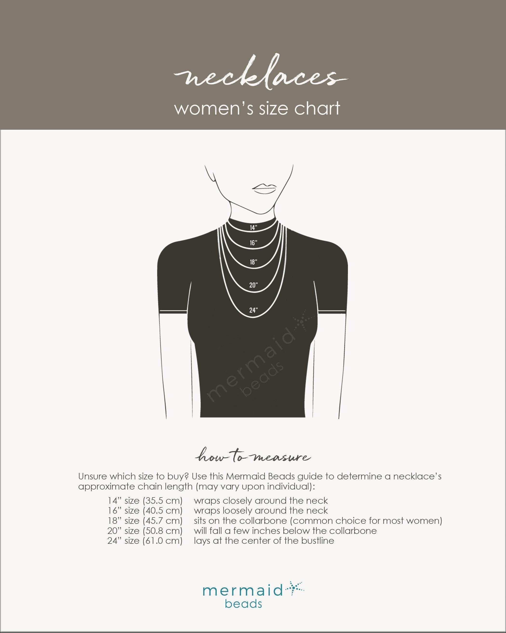 Our necklaces are handmade just for you. To select the perfect fit, scroll through the images to view our Necklace Size Chart. If you're unsure which length to order, here's a simple method to help you find the perfect length:
