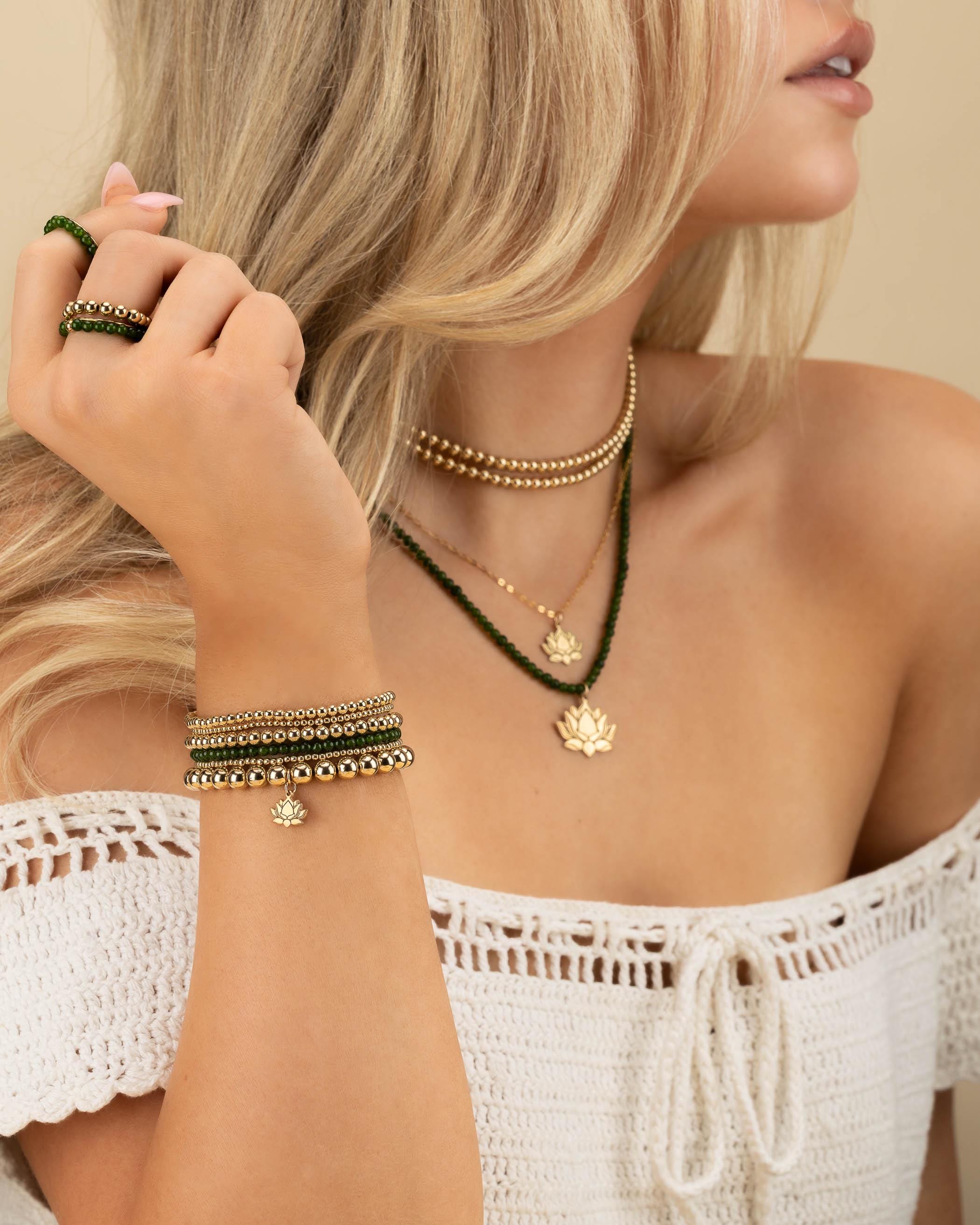 Beautiful charm bracelets and anklets with our custom made charms. Our precious metal beaded bracelets and anklets are hand-strung on high-quality stretch cord. Mix and match bead sizes & colors for your own unique bracelet or anklet stack.