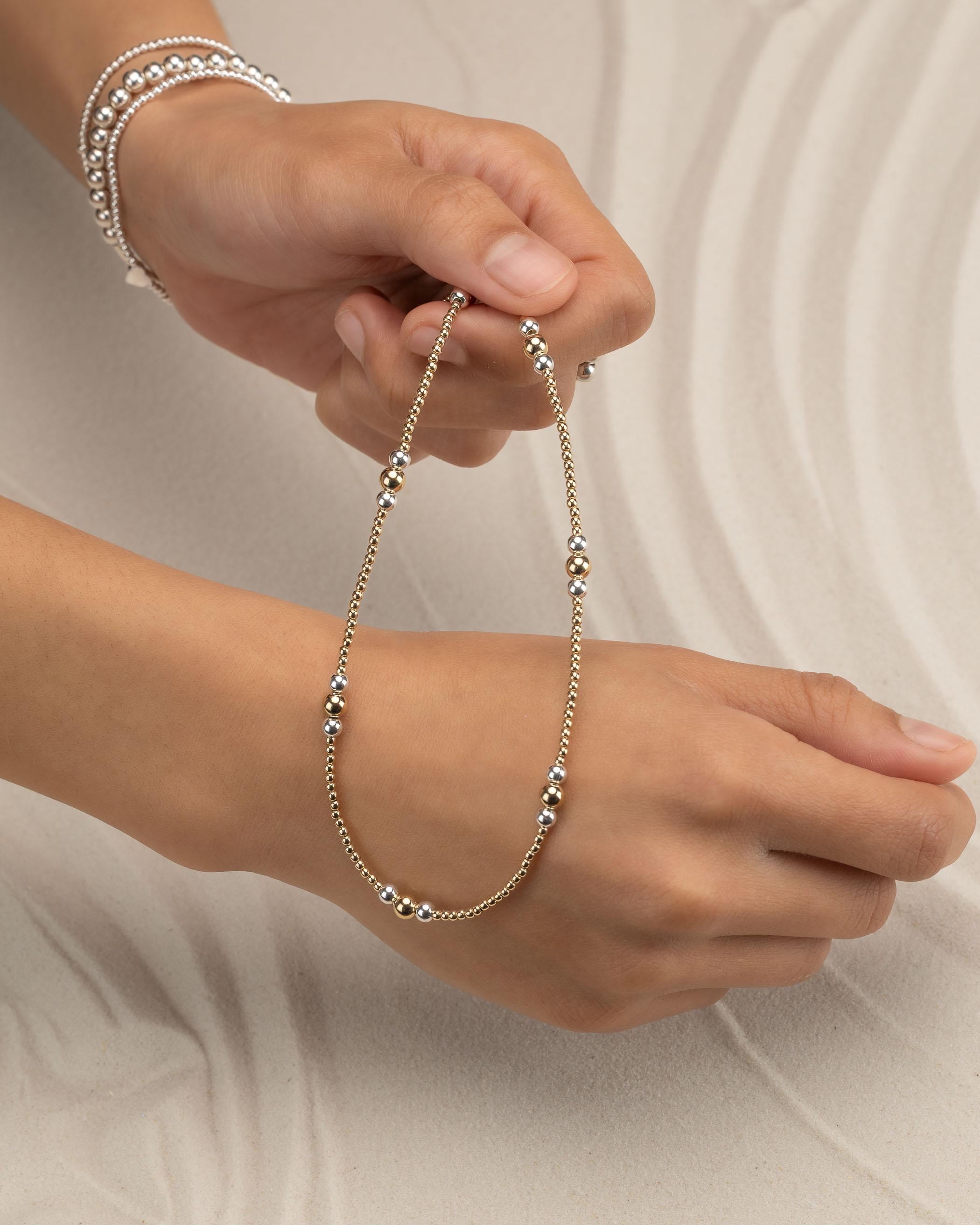 Our design features sections of 2mm 14k gold-filled beads with clusters of 3 larger beads: 4mm Sterling silver beads and a 5mm 14k gold-filled bead.