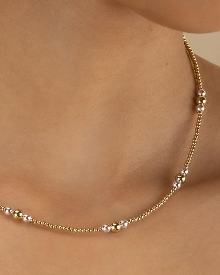 Our design features sections of 2mm 14k gold-filled beads with clusters of 3 larger beads: 4mm Sterling silver beads and a 5mm rose gold-filled bead.