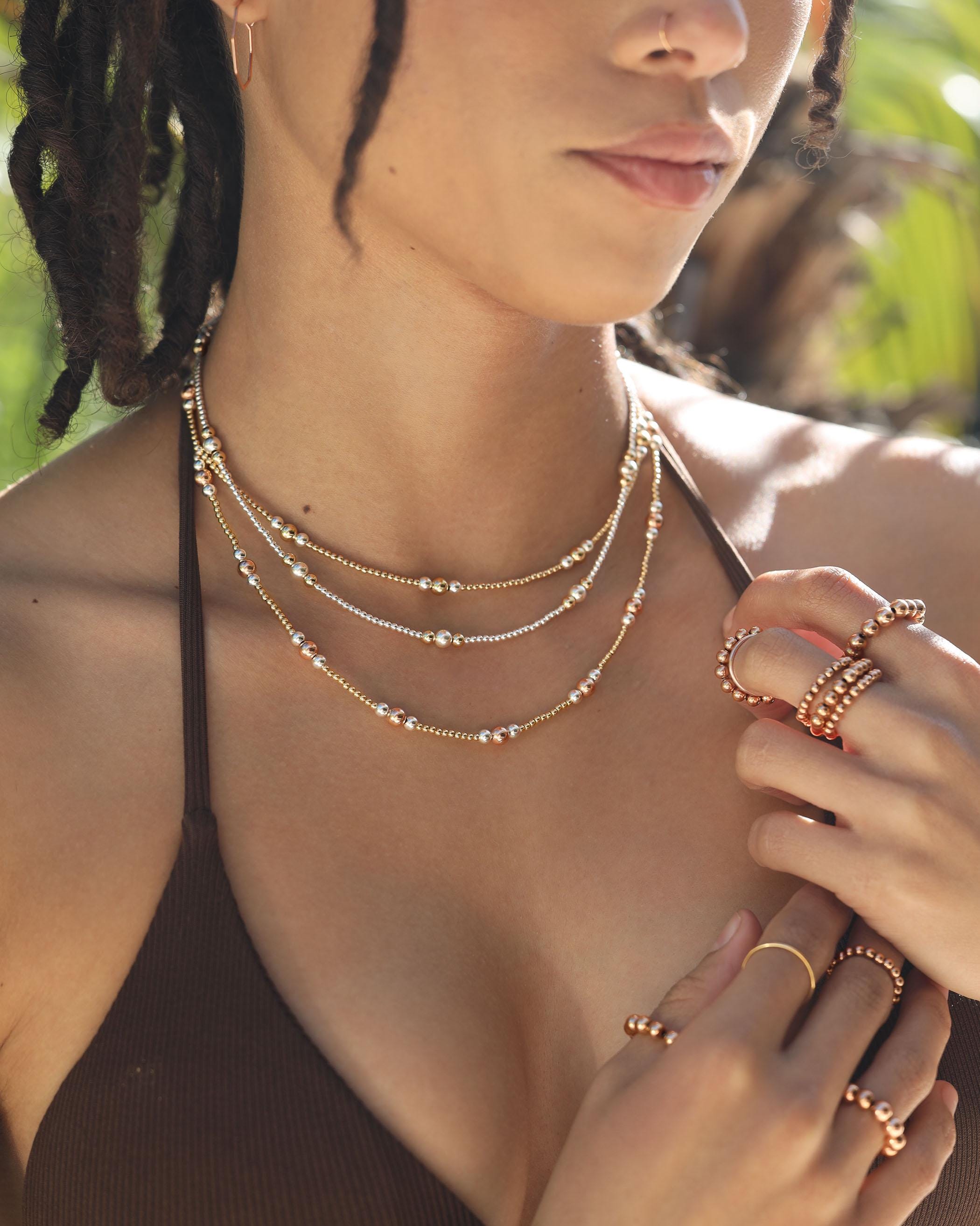 Handcrafted beaded necklaces in 3 metal colors: 14k gold-filled, .925 Sterling silver and rose gold-filled.