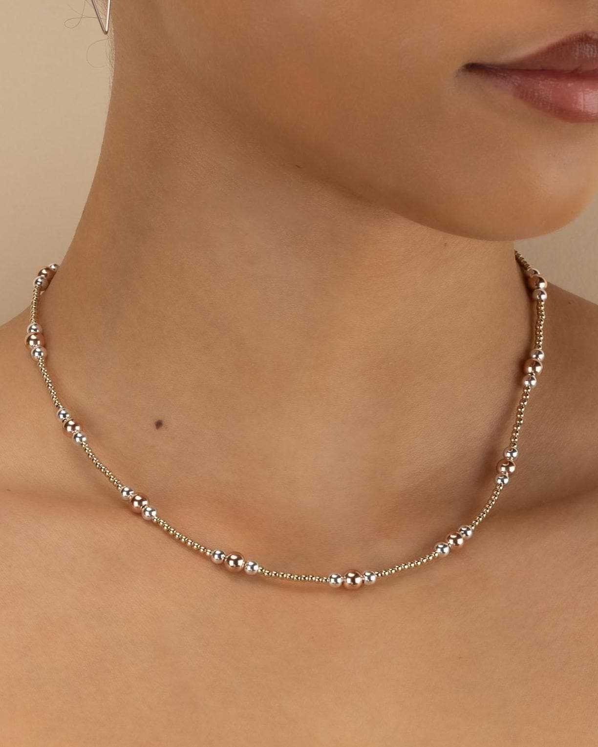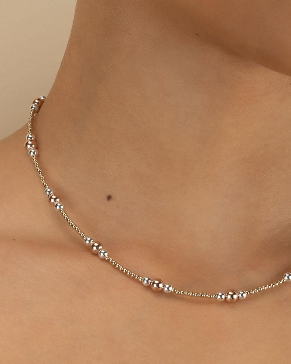 Our design features sections of 2mm 14k gold-filled beads with clusters of 3 larger beads: 4mm Sterling silver beads and a 5mm rose gold-filled bead.