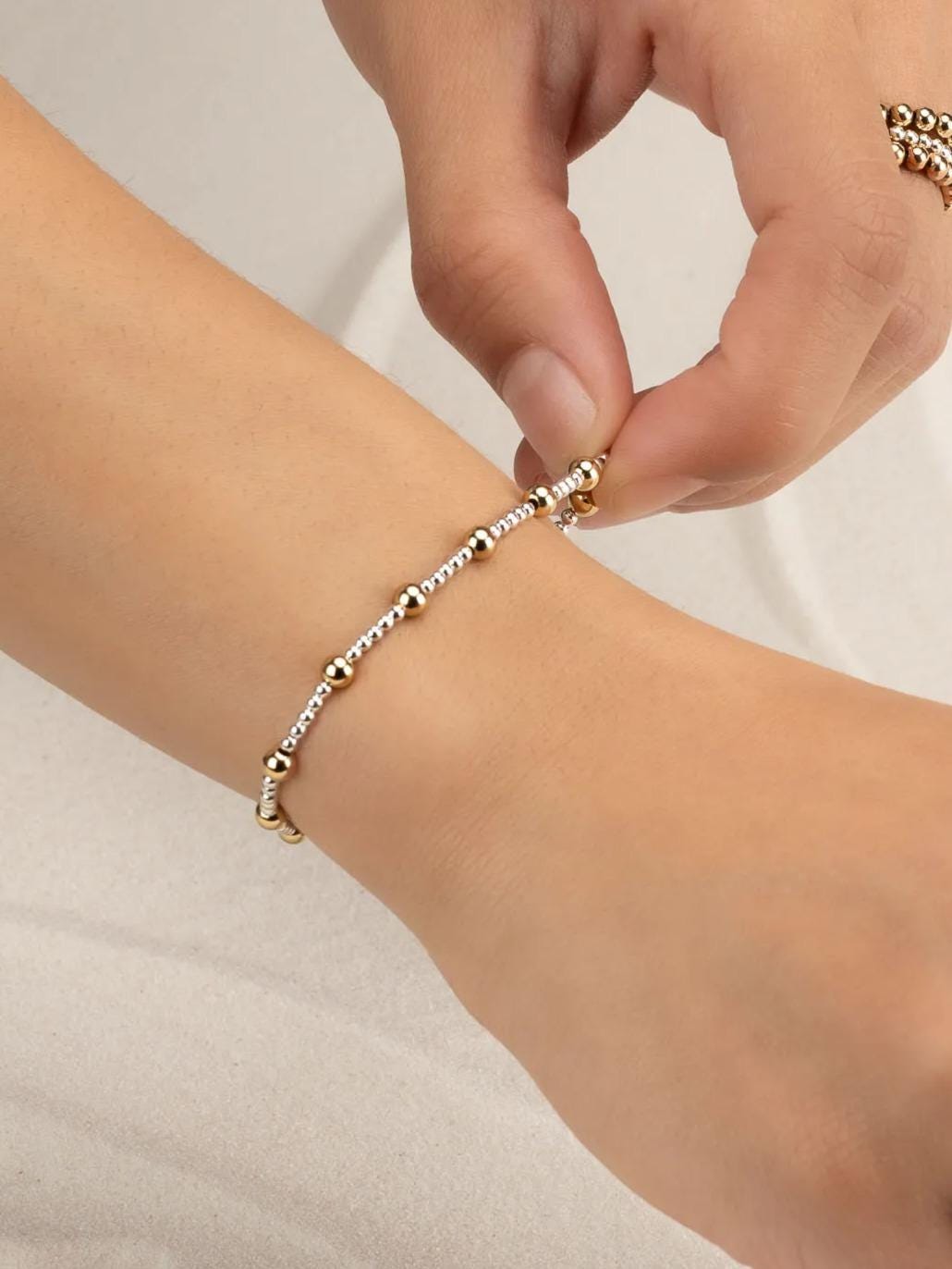 Discover the perfect blend of elegance and everyday wearability with our mixed metal bracelet, thoughtfully designed to complement your style with both sterling silver and 14k gold-filled beads. This versatile piece is waterproof, making it an ideal addition to your everyday bracelet stack. Inspired by beach lovers and crafted with care, it offers a unique two-tone look that pairs beautifully with your favorite jewelry.