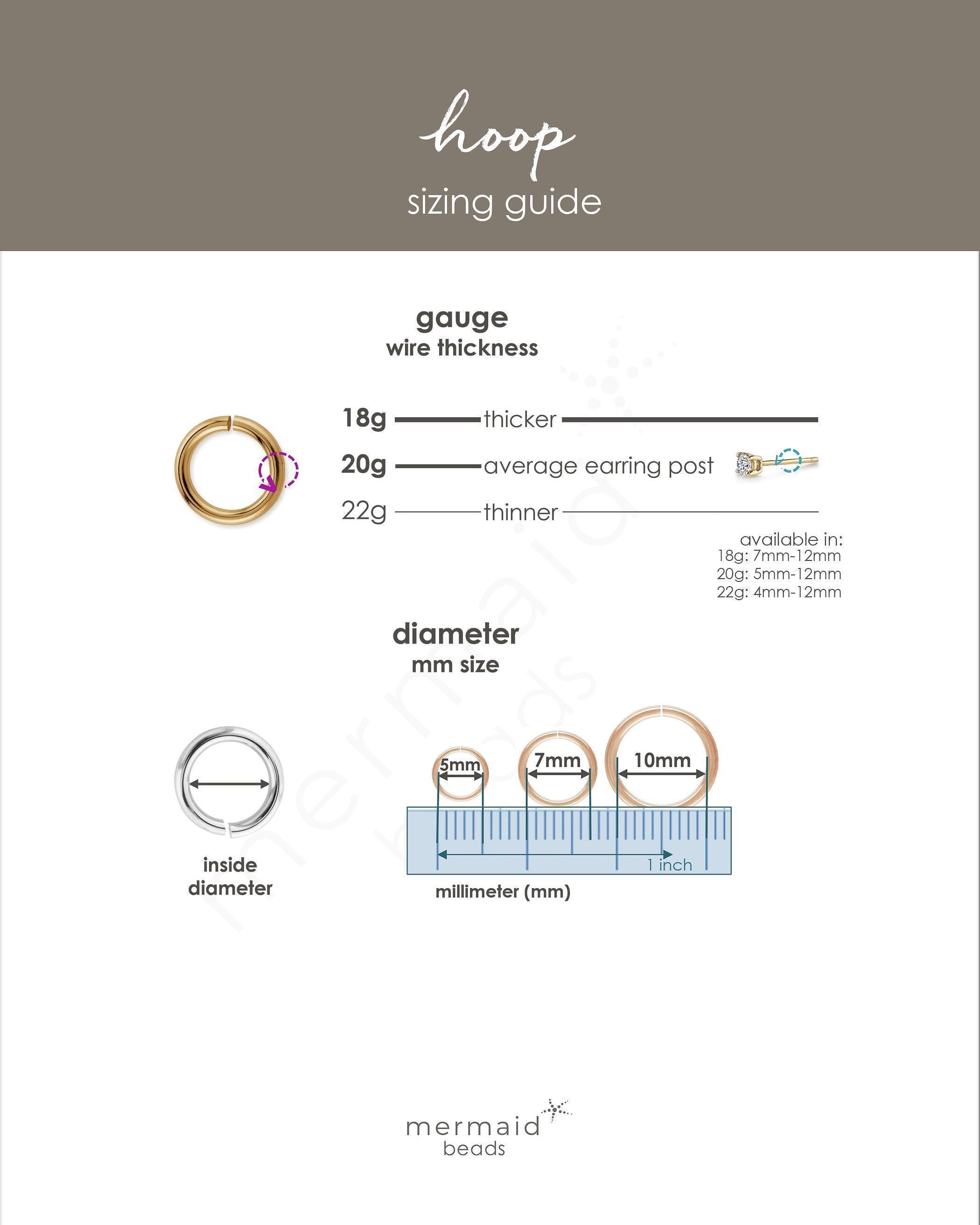 • Gauge size refers to the wire thickness | 20 gauge is about the thickness of an average earring post | 22 gauge is thinner and more delicate | 18 gauge is slightly thicker